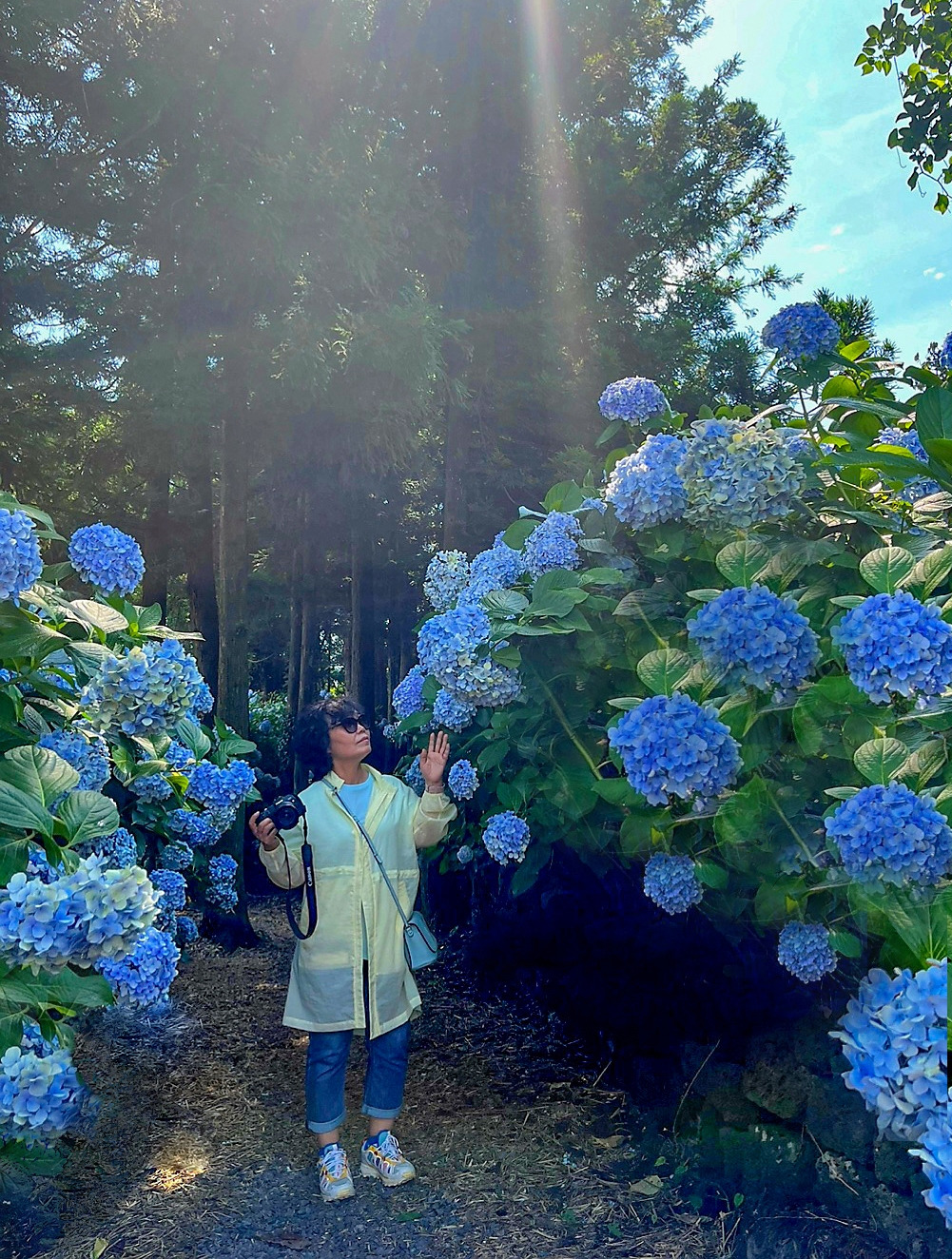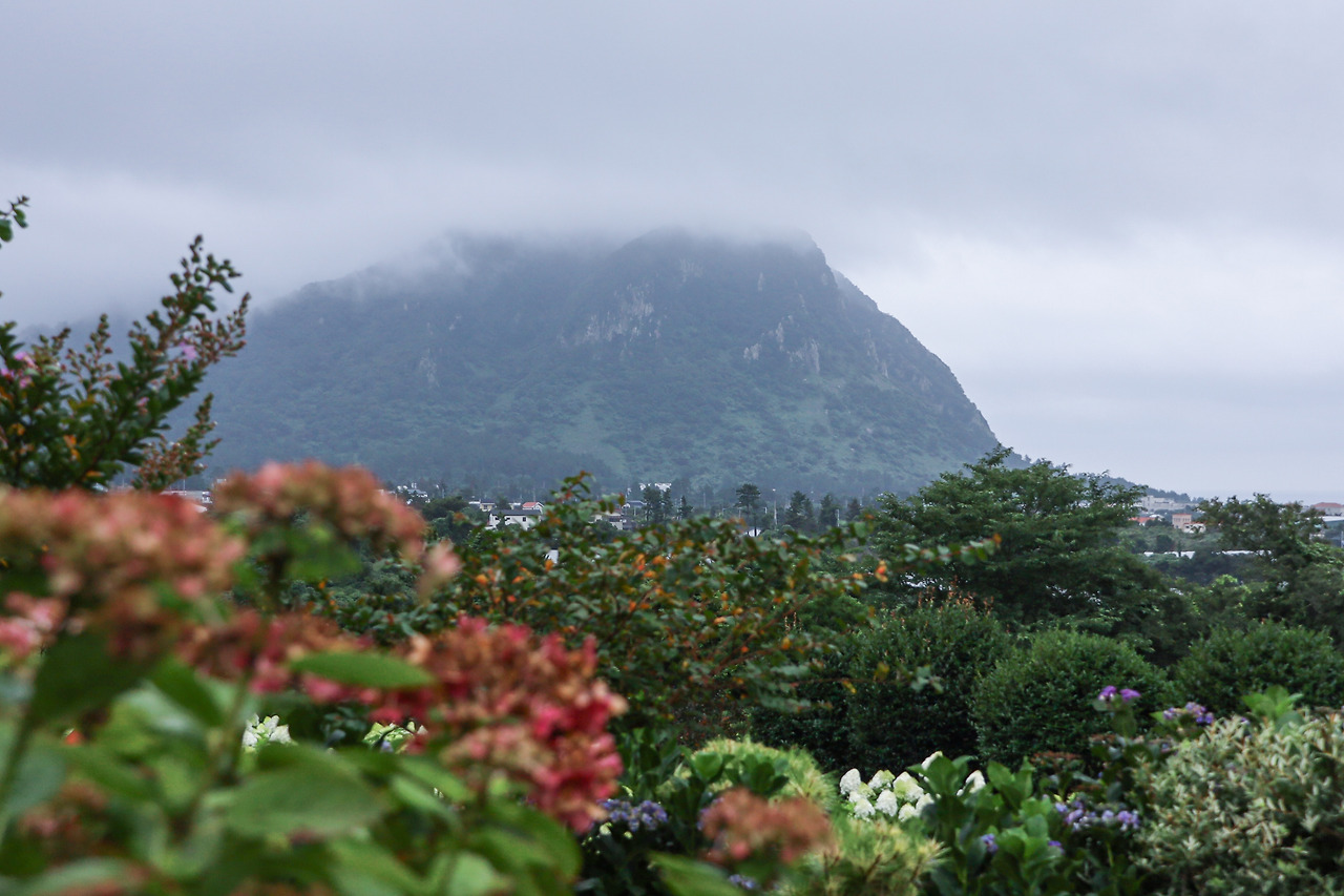 또 찾아간 마노르블랑카페는 입장료가 따로 있고 넓은 주차장도 잘 되어 있었다. 전망도 좋은 높은 지대에 있는 이곳 카페에서도 수국꽃과 다른 꽃들이 잘 가꾸어져 있었다. 비가 내려서 이미 미끄러워진 바위 계단으로 내려가며 다니지는 못했다. 안타까운 마음으로 잠시 제주의 산방산을 보고 감상하면서 쉬었다. 제주에도 비가 내렸다.