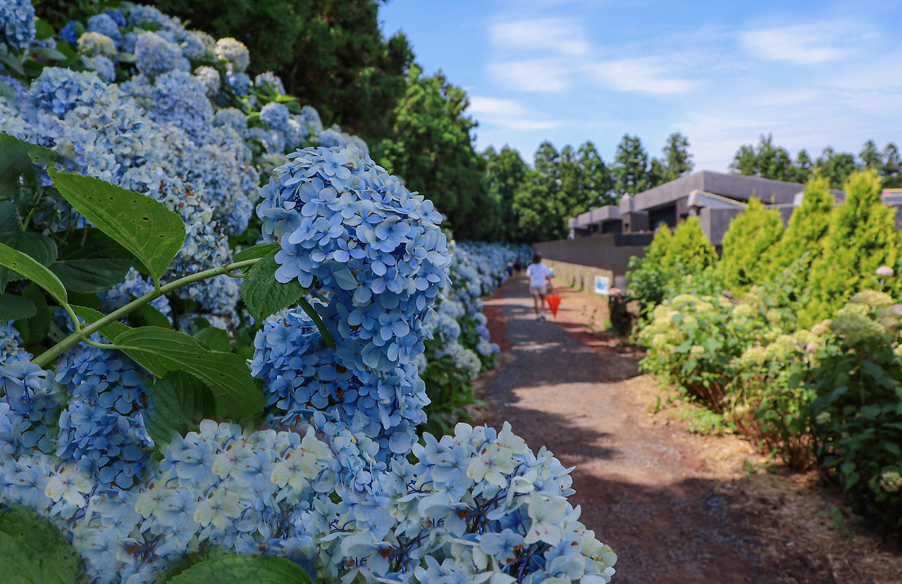 그리고는 제주 수국꽃도 볼 겸 보롬왓이라는 농원으로 갔다. 꽃과 나무 등 가꾸는 모습도 보였고 실내부터 실외까지 모두 볼 수 있었다. 온실 같은 실내에도 수국이 많이 있었고 햇빛 때문에 대여해 주는 빨간 우산을 쓰고 밖으로 나가니 100m도 넘을듯한 수국꽃길이 사람들을 끌었다. 6월에 만개했던 수국꽃들이 군데군데 시들긴 했지만 잘 가꾸어진 걸 볼 수 있었다. 어떻게 사진을 찍어야 하나 여기저기 보고 또 보면서 걸어서 걸어서 꽤 다녔다.