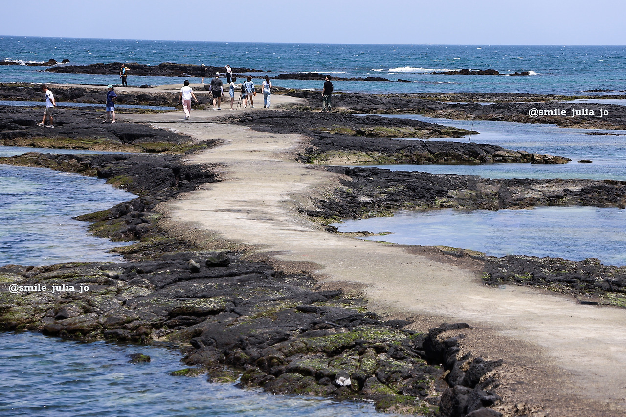 제주에 몇 번 왔지만..... 이번에 처음 보는 김녕바닷길로 찾아서 갔다. 바닷가에 바위로 길이 구불구불 있었다. 물때를 맞추어서 오지 않으면 구경도 못한다는 그 바닷길이 훤히 보였다. 바닷물이 들어오면 길은 없고 바다만 보이는 곳이었다. 물이 빠진 곳을 사람들이 재미있다는 듯이 걸어서 다녔다. 바람이 꽤 불었지만 사진도 찍고 신기해하고 재미있어했다. 걸어보고 또 걸어보고 주위도 둘러보았다. 바람 때문에 머리도 옷매무새도 엉망이었지만 여행의 추억이 만들어지는 곳 김녕바닷길이었다.