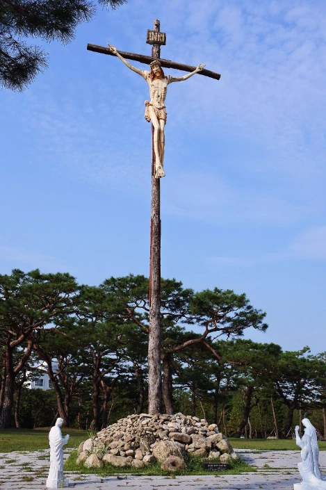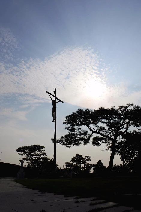 늦은 오후, 햇살이 내리꽂는 ‘솔뫼 성지’ 안 예수님 십자가.