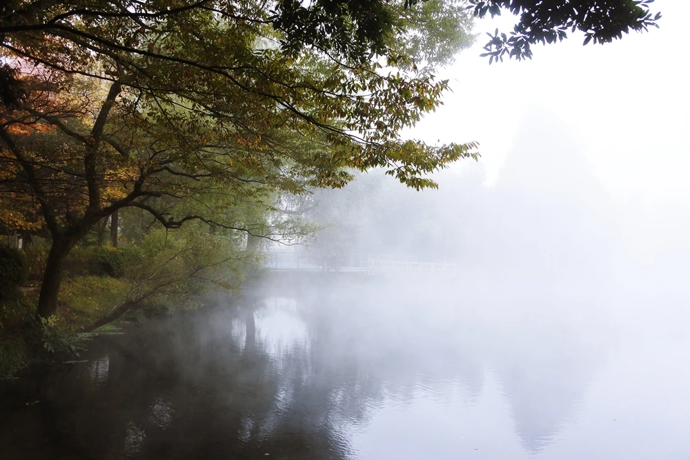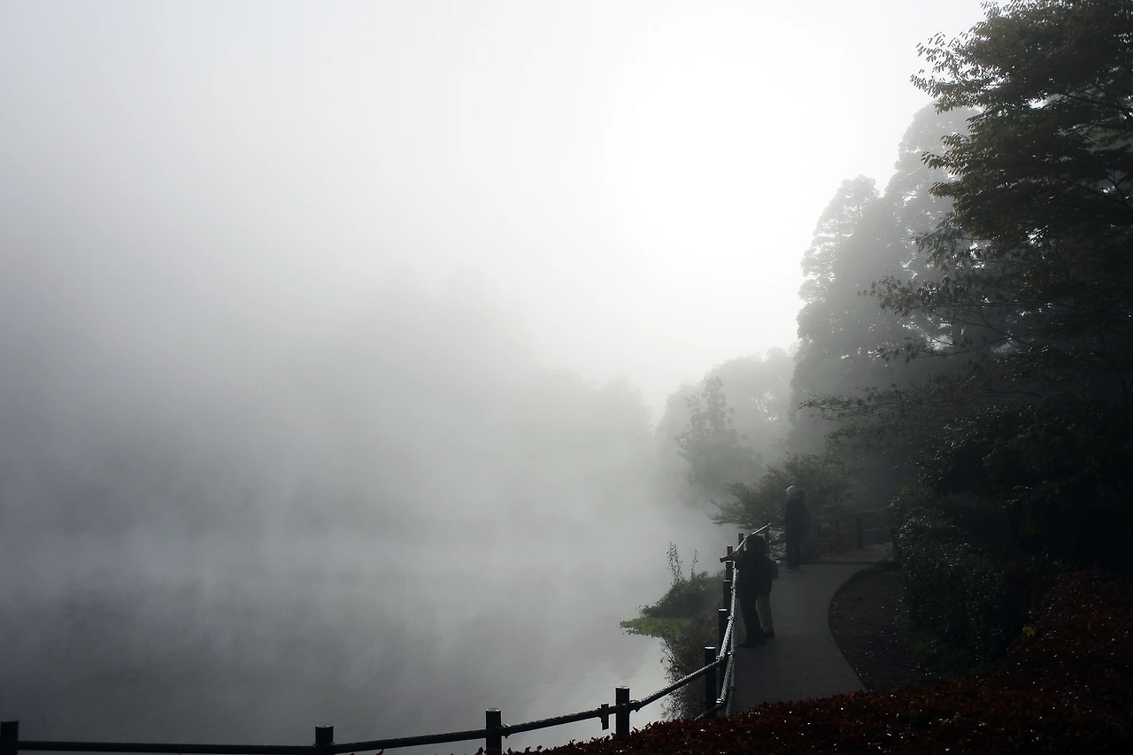 긴린코 근처로 다가서자, 서서히 보이는 물안개.
