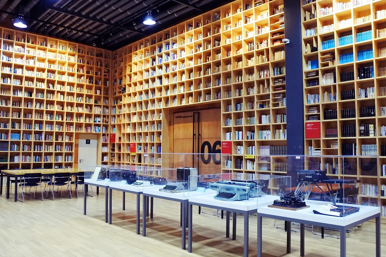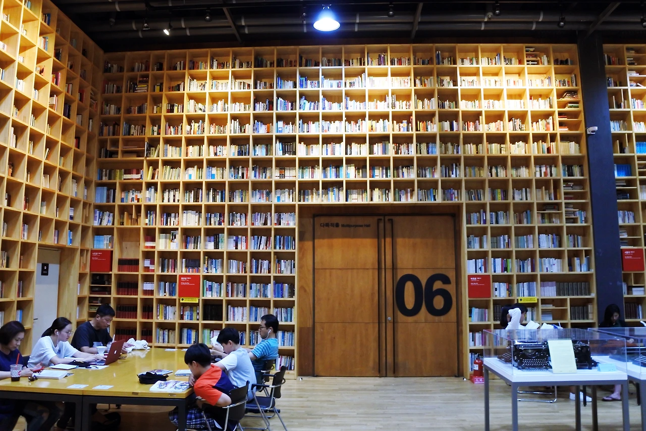 한쪽 벽면은 책으로, 다른 쪽 벽면은 공동 프로젝트를 위한 리서치 자료용,