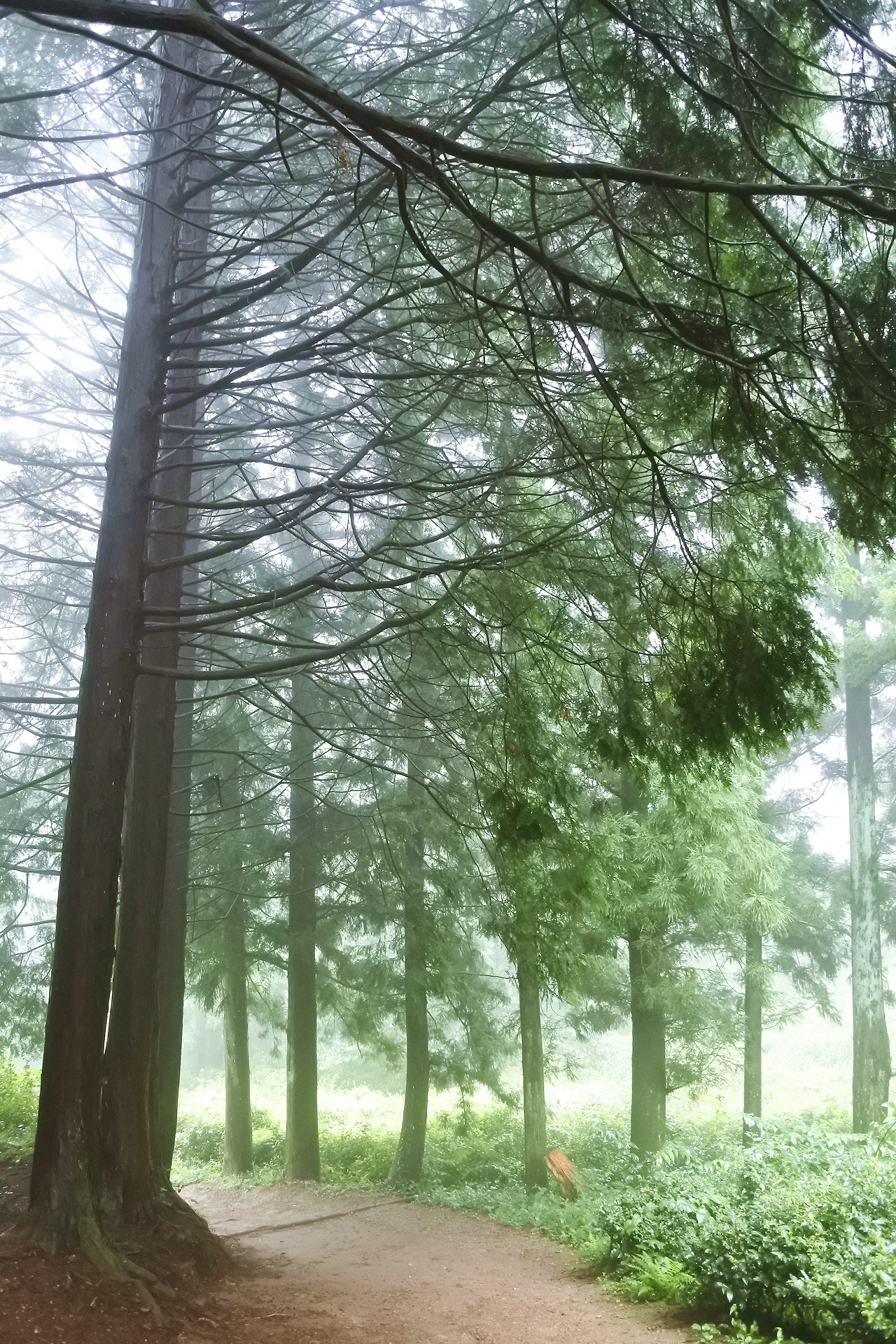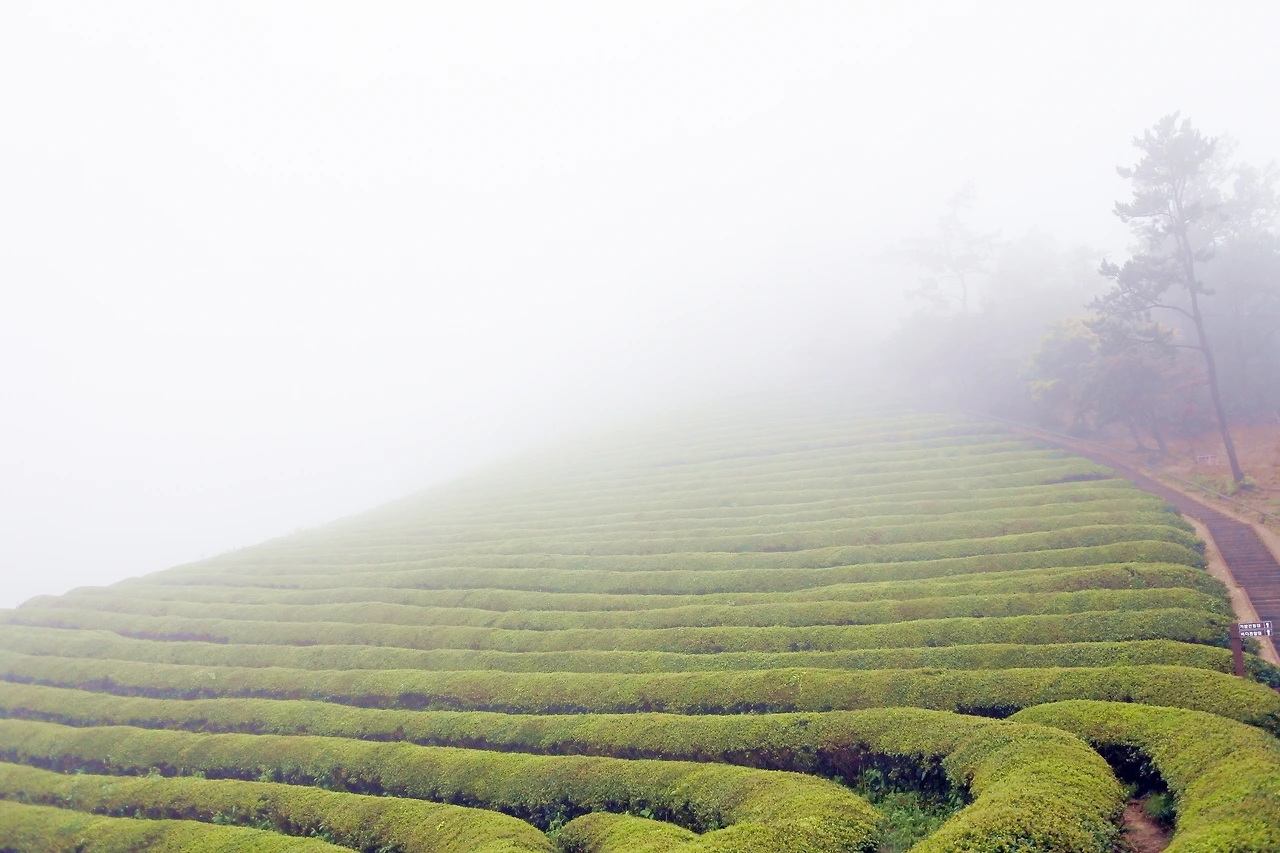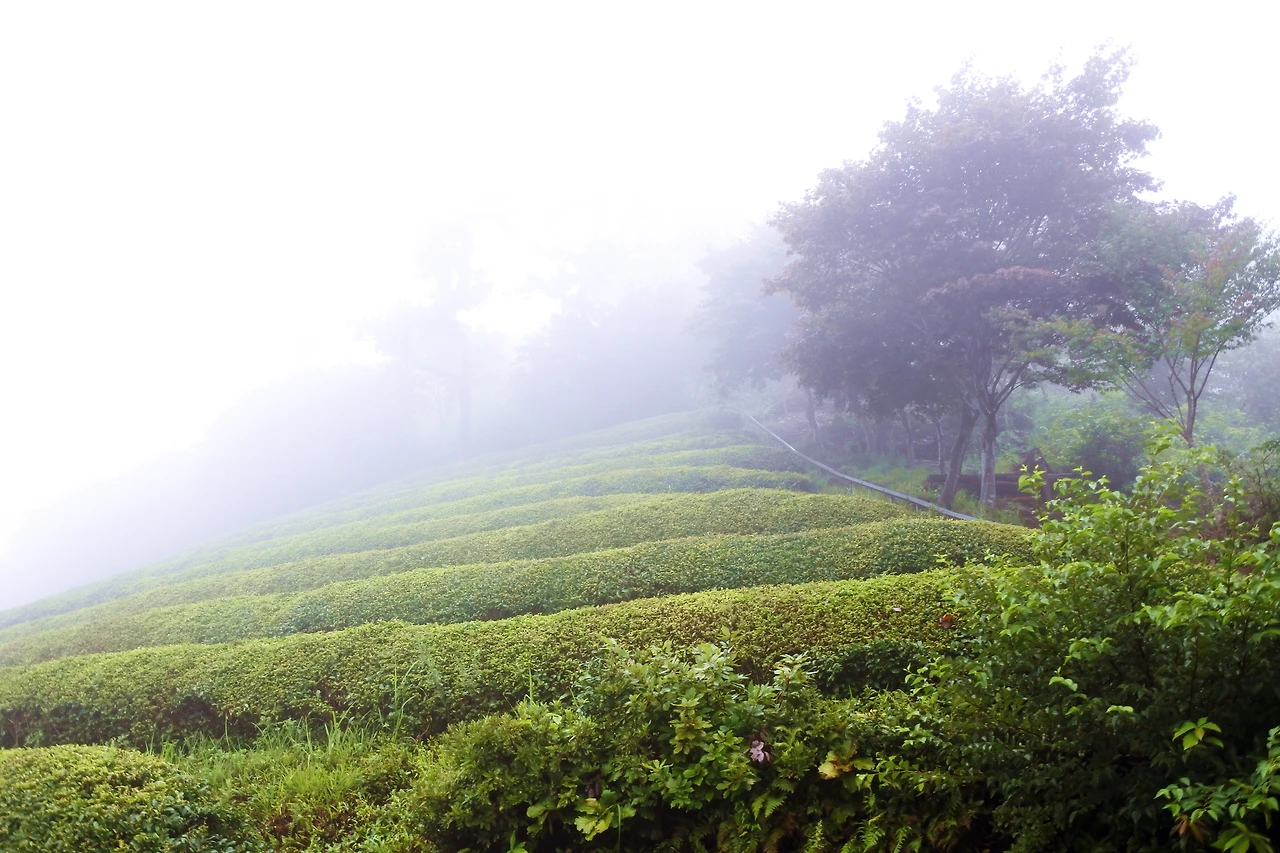 차밭 너머 산길로 들어서니, 안개 자욱한 그 길 어디선가 초록 요정이 불쑥 튀어나올 것만 같다.
