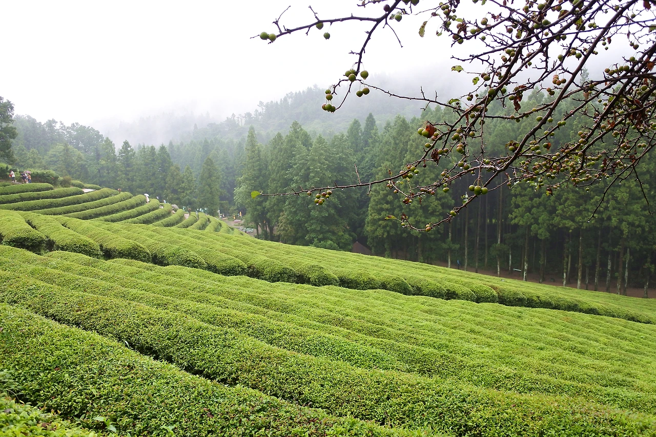 굽이치며 흐르는 능선 사이, 보슬비 젖은 찻잎들의 숨소리가 소곤소곤 들려오는 듯.