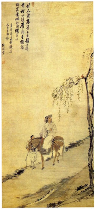 : 꾀꼬리 소리는 맑고 고운 아침 새소리의 대명사와도 같다. 나귀를 타고 가던 선비가 문득 멈춰 서서 버드나무 가지 위의 꾀꼬리 소리를 듣고 있다. 화폭 왼편 위쪽에는 그림에 대한 시가 쓰여 있다.