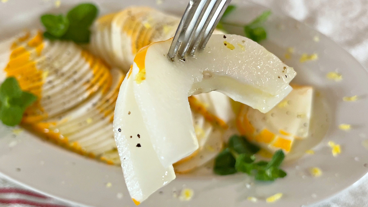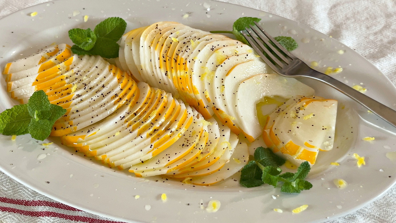 3. 접시 위에 참외를 넓게 펼쳐 올려주고, 레몬즙과 레몬 제스트, 소금, 후추, 올리브 오일을 뿌려준다.