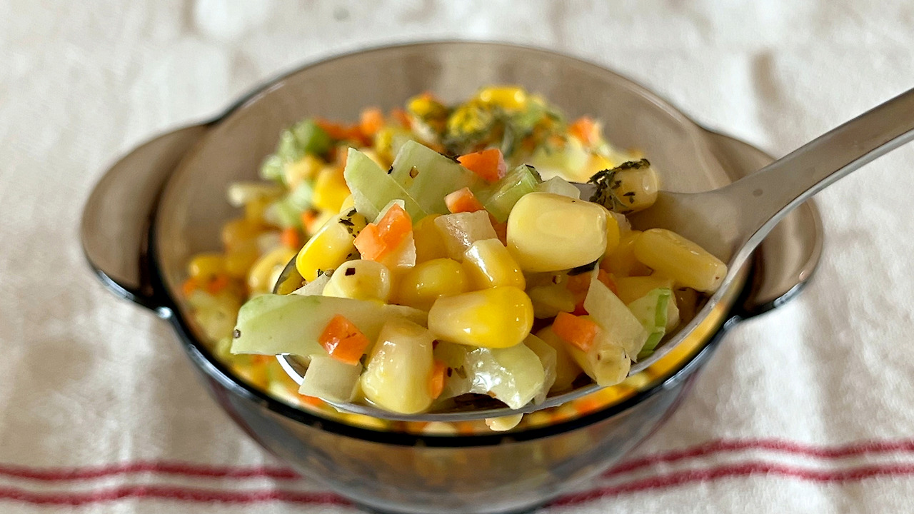 슬슬 더움이 느껴질 즈음 과한 향긋함을 느끼고 싶어 만들었던 '오이 샌드위치'. 그 이후로 봄 또는 여름 하면 향긋한 요리들이 생각난다. 봄은 약간의 포근함을 갖고 있는 부드러운 향긋함이었다면 여름은 시원하고 개운한 느낌의 강한 향긋함으로 느껴진다. 그래서 봄에 했던 요리와는 다르게 조금 더 강한 향긋함을 줄 수 있는 '셀러리'를 사용했다. 기본 베이스는 여름 제철 식재료를 사용해서 만들 수 있는 콘샐러드. 비록 통조림 옥수수를 사용했다는 점이 아쉽긴 하지만 옥수수를 찜통에 넣어 30-40분이나 찌는 것은 여름에 하기 버거운 일이니까. 하지만 통조림 옥수수의 아쉬움을 셀러리로 채울 수 있다. 생옥수수 특유의 신선함이 줄어든 통조림 옥수수에 셀러리를 넣어 부족했던 향을 더해주자.