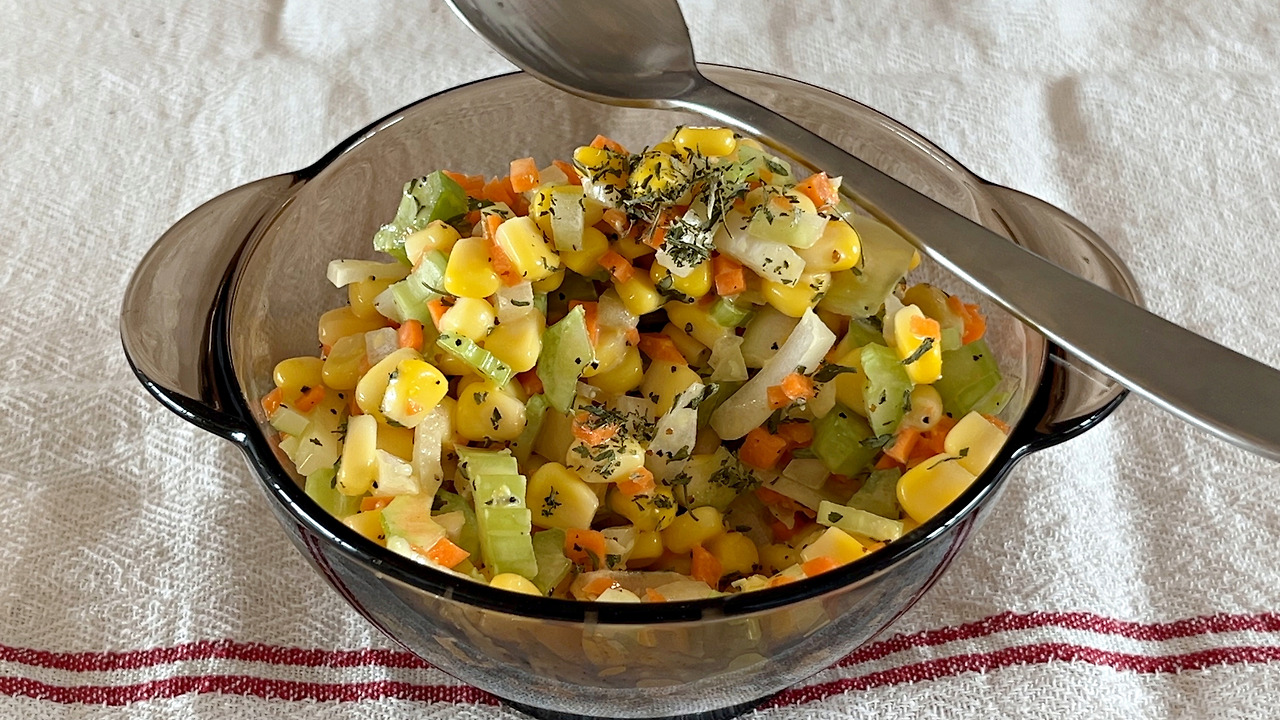 옥수수 380g, 양파 1/4개, 당근 1/3개, 셀러리 100g, 설탕 1큰술, 소금 약간, 후추 약간, 마요네즈 2큰술, 머스터드 소스 1큰술, 파슬리 1작은술