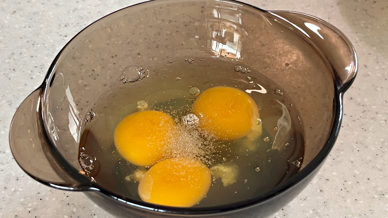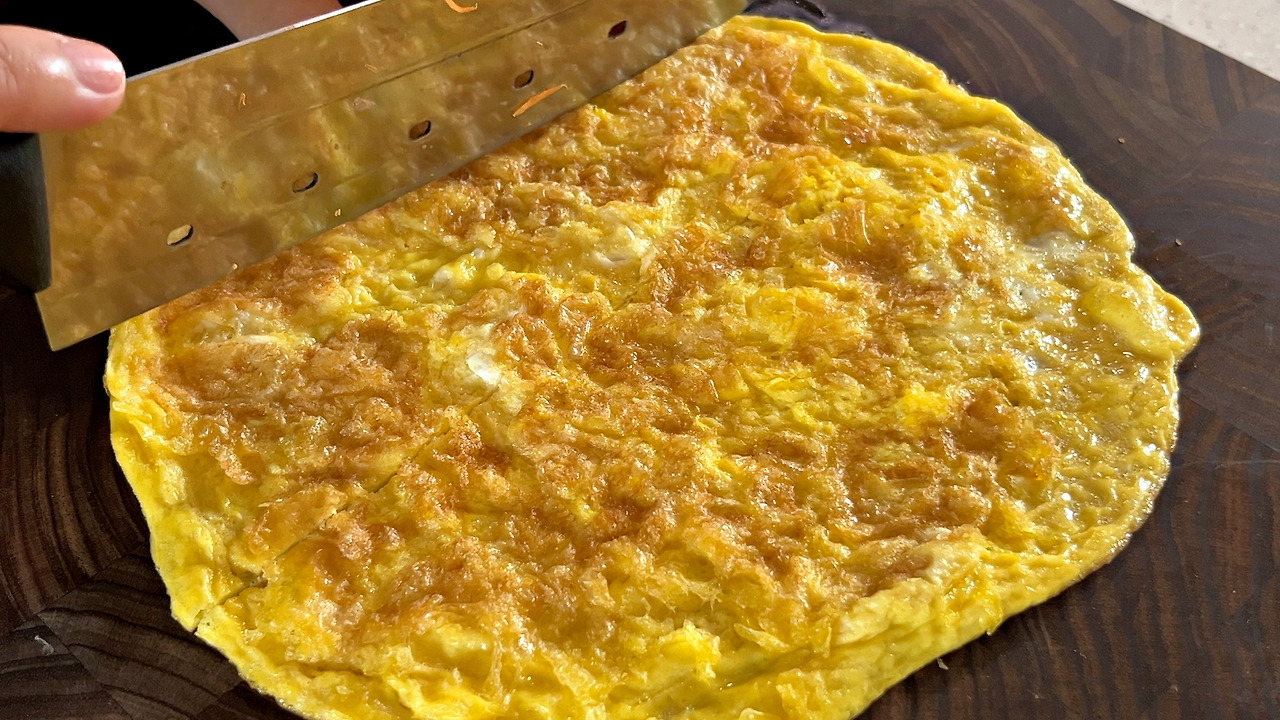 3. 달군 팬에 식용유를 두르고 계란을 부어 약불에서 천천히 익혀준 후에 4등분으로 썰어준다.