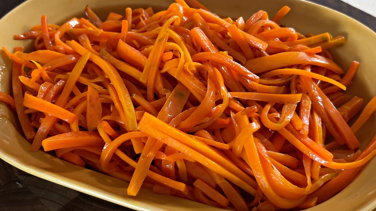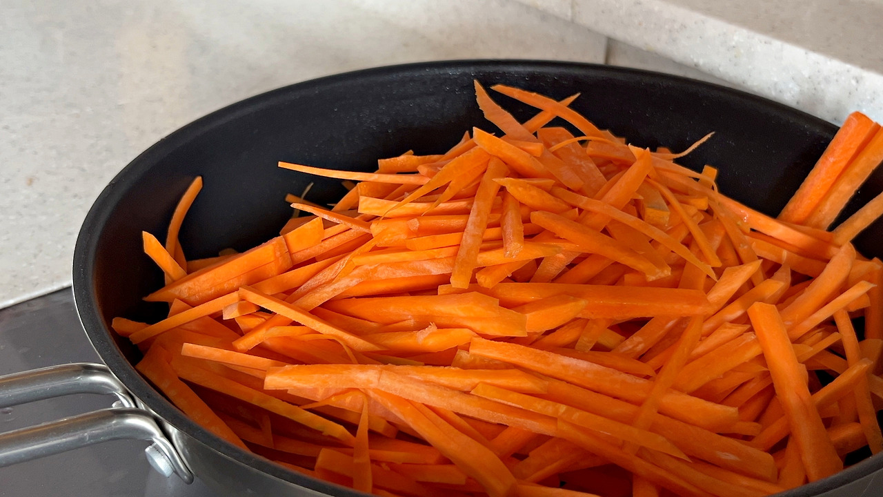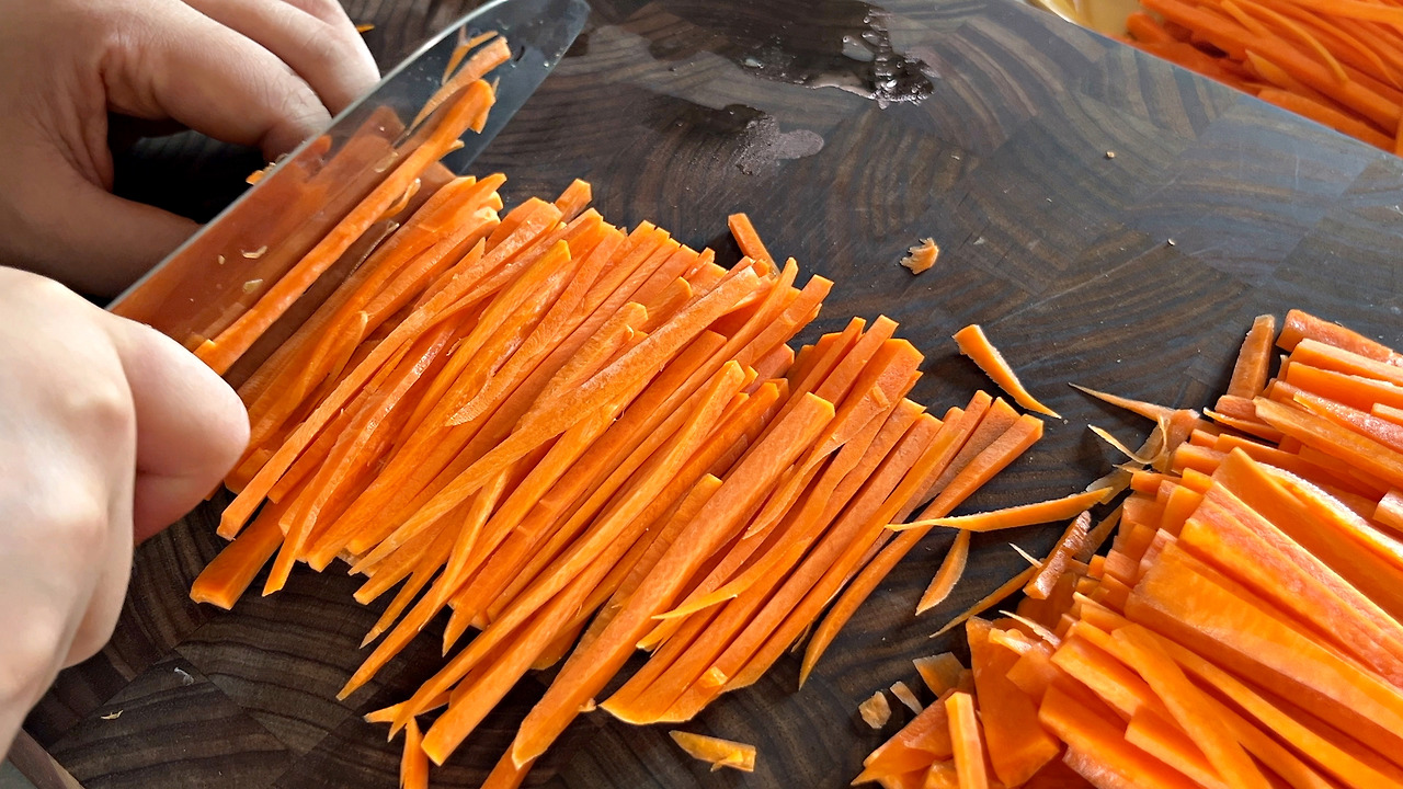 내가 가장 채를 썰기 어려워하는 채소 중 하나가 바로 당근이다. 당근은 매우 단단하기 때문에 칼질을 할 때 손에 힘이 많이 들어가 다칠 위험 또한 높기 때문이다. 그러니 굳이 칼로 채를 썰려고 하지 말고, 채칼을 사용해 편하게 채를 써는 것을 추천한다.
