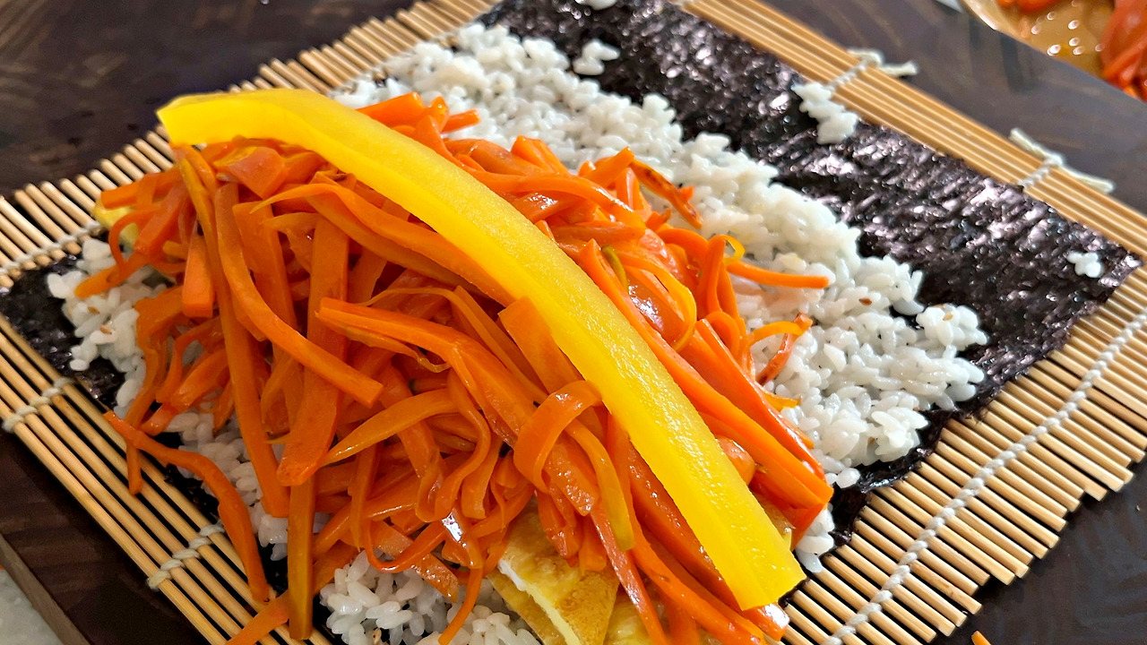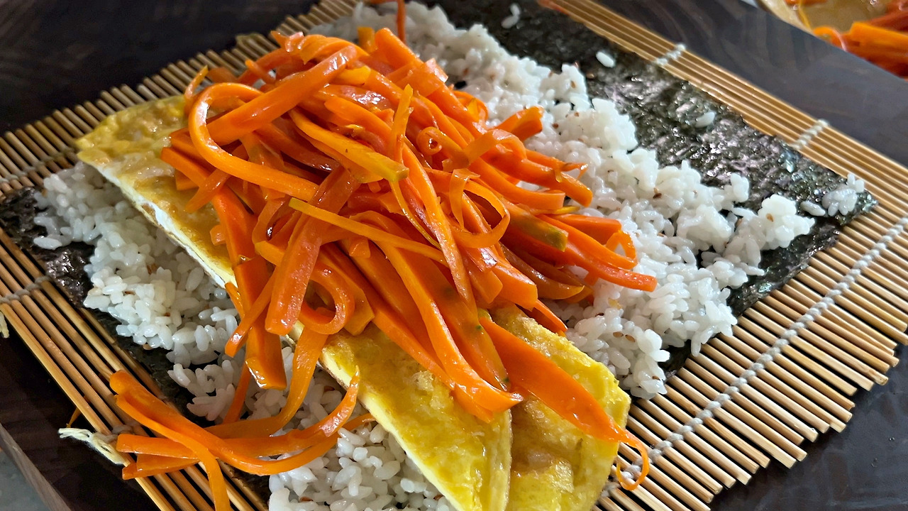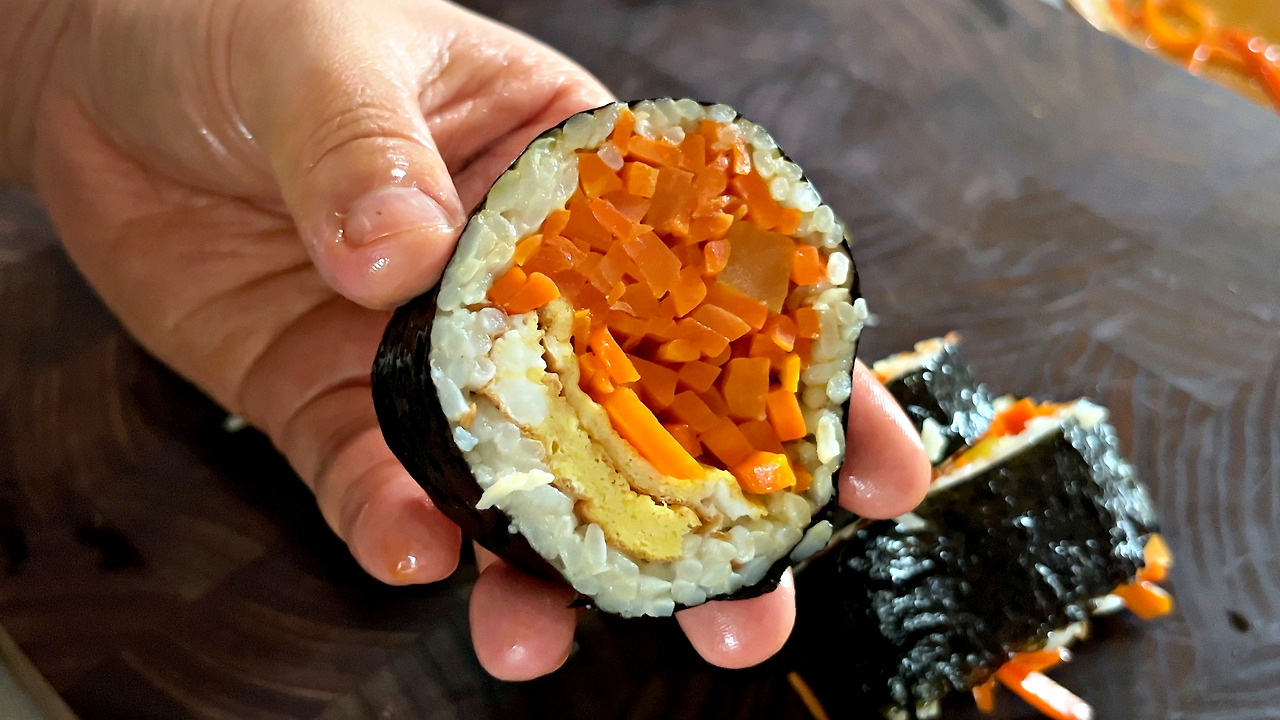 당근 김밥의 포인트는 당근을 얼마나 많이 넣을 수 있는지다. 당근은 무조건 많이 넣어야 맛있다. 걱정될 만큼 과하게 넣은 김밥이 가장 맛있었다. 난 비록 욕심 때문에 김밥 옆구리가 터져버렸지만 그래도 터진 김밥의 맛이 가장 좋았다.