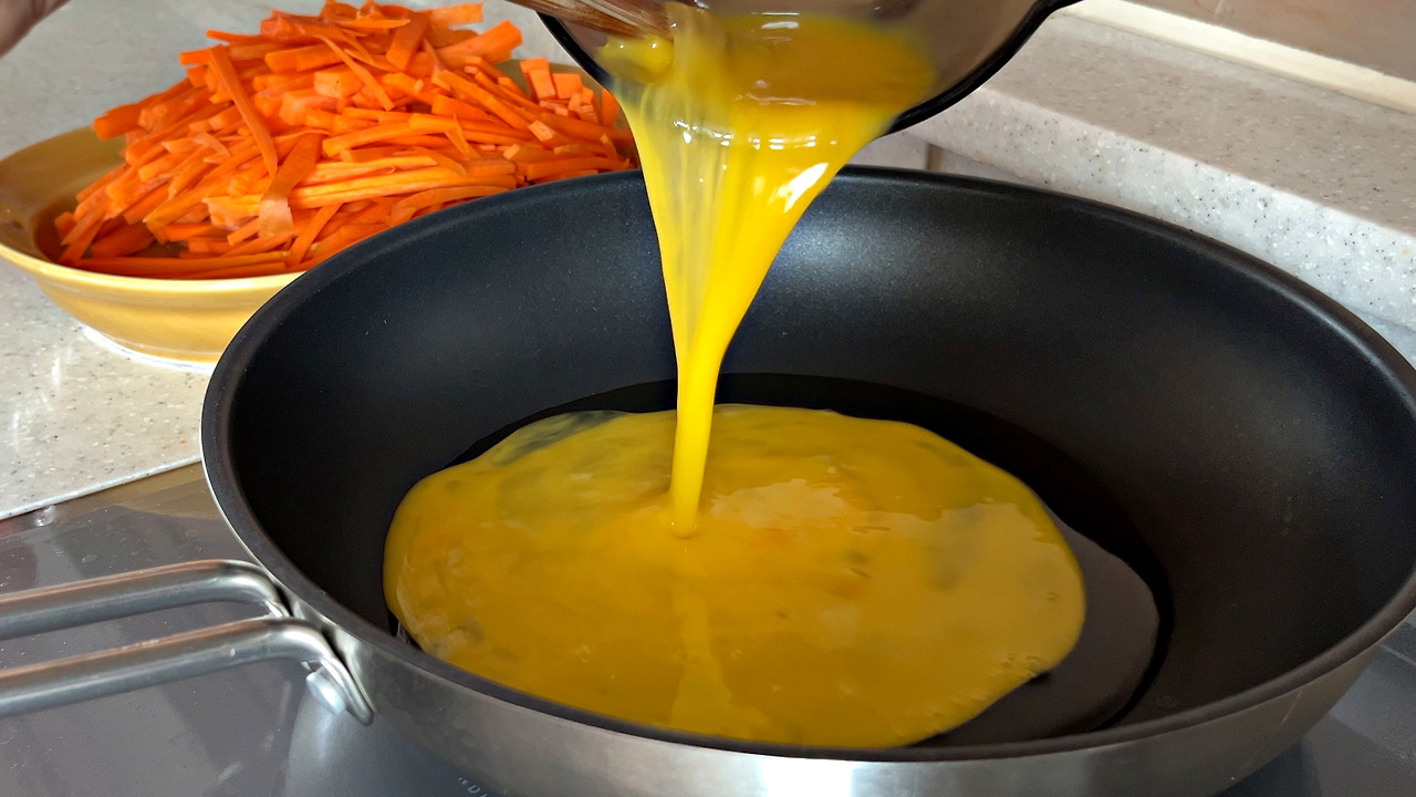 1. 당근은 얇게 채 썰고, 계란은 소금을 약간만 넣어 곱게 풀어 준비한다.