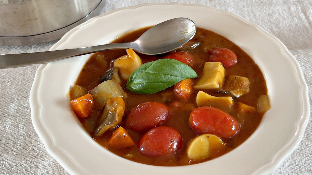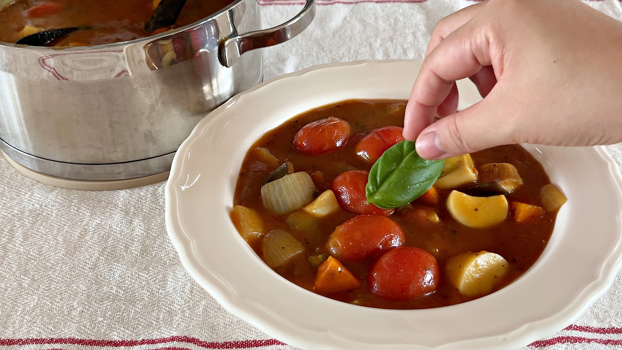 6. 스튜를 그릇에 담고 바질 잎을 올려 마무리한다.