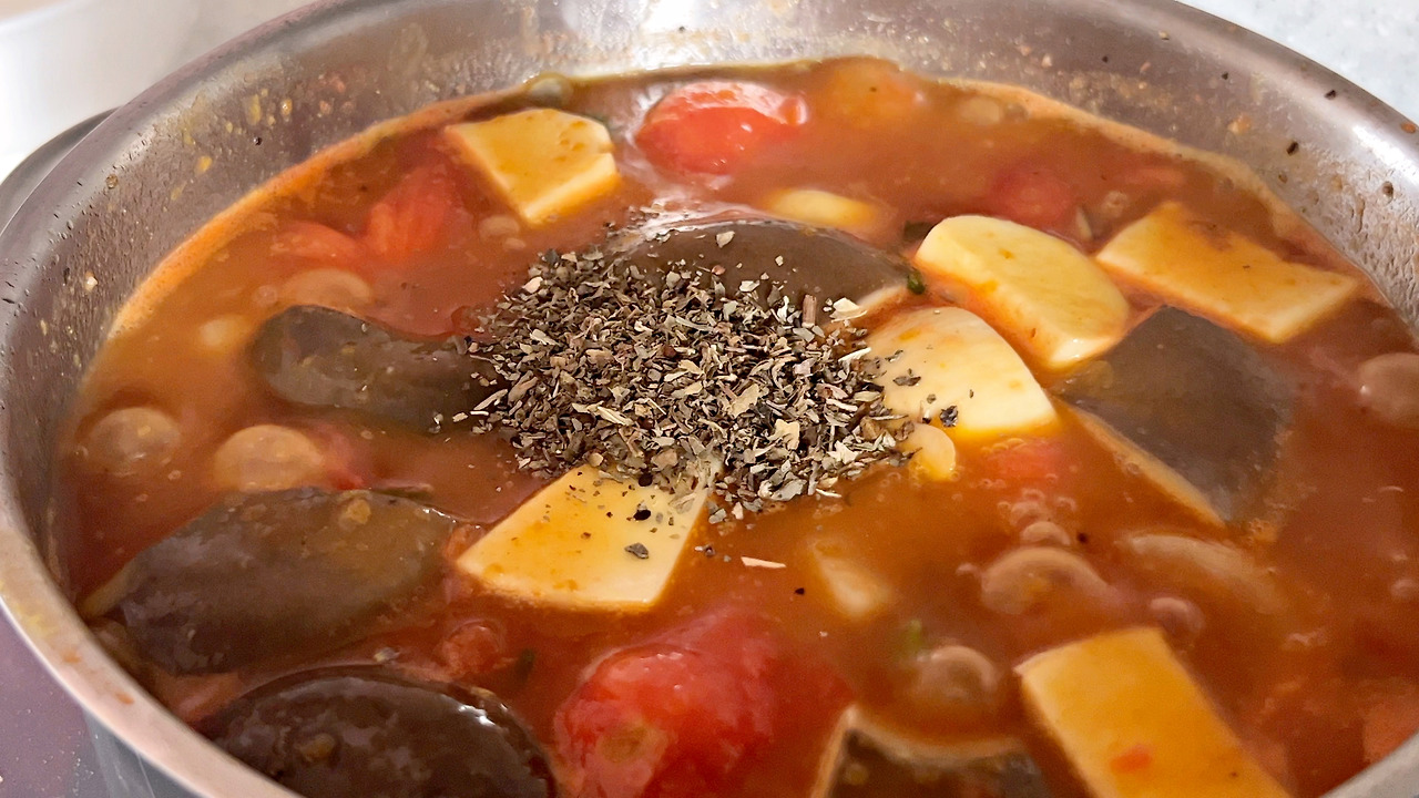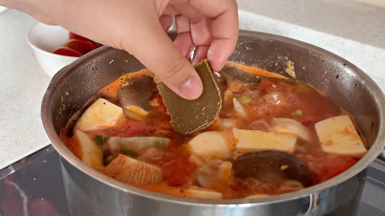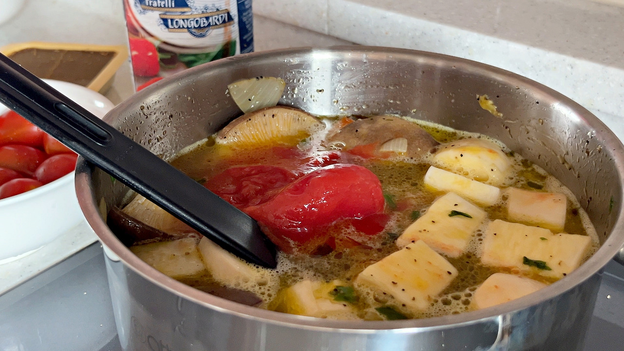 토마토홀은 생각보다 아주 진하고 깊은 맛을 내준다. 껍질만 깐 토마토의 맛을 상상하고 잔뜩 넣어버리면 간이 너무 세질 수가 있다. 일단 토마토홀 2개만 넣어보고, 간을 본 뒤에 추가로 넣어주자. 우리는 나중에 방울토마토까지 넣어줄 예정이니 이 점도 생각하고 양 조절을 해야 한다.