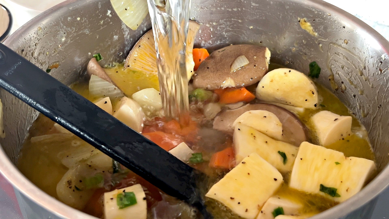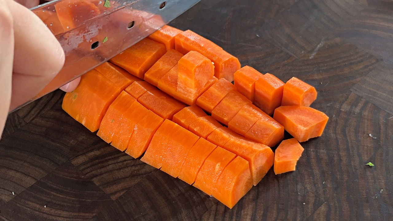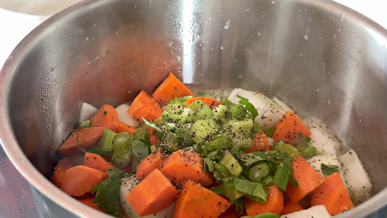 채소를 넣는 순서는 익는 순서에 따라 차이를 두었다. 딱딱해서 오래 익혀야 하는 당근, 양파, 셀러리는 처음부터 볶기 시작해 오랜 시간 동안 익힐 수 있도록 했다. 만약 이 레시피에 나와있지 않은 채소를 넣을 계획이라면 익는 순서를 고려해 볶는 시점을 결정하면 되겠다.
