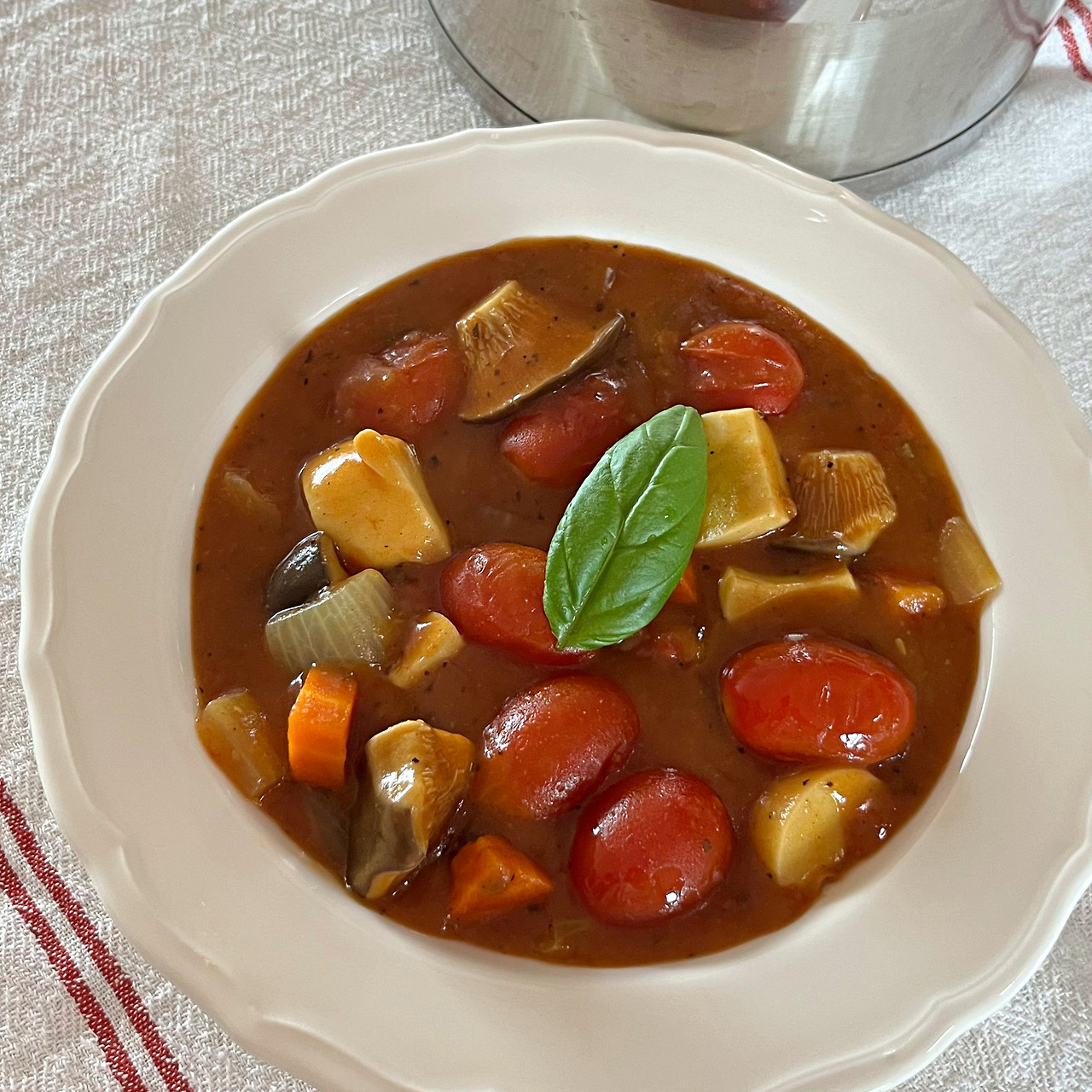 버섯 200g, 다진 샐러리 2큰술, 양파 1/2개, 당근 2/3개, 방울토마토 10개, 설탕 1큰술, 소금 1/2작은술, 후추 약간, 카레 6인분, 물 700ml, 토마토홀 170g, 말린 바질 1/2큰술