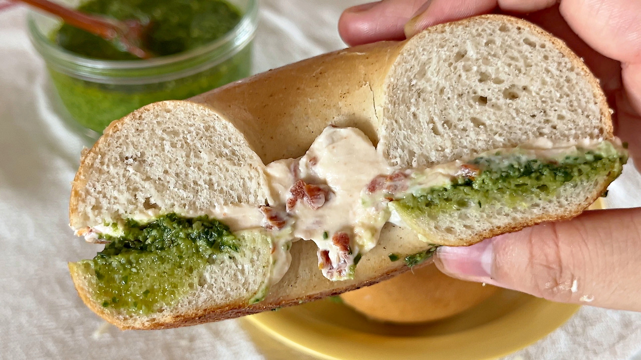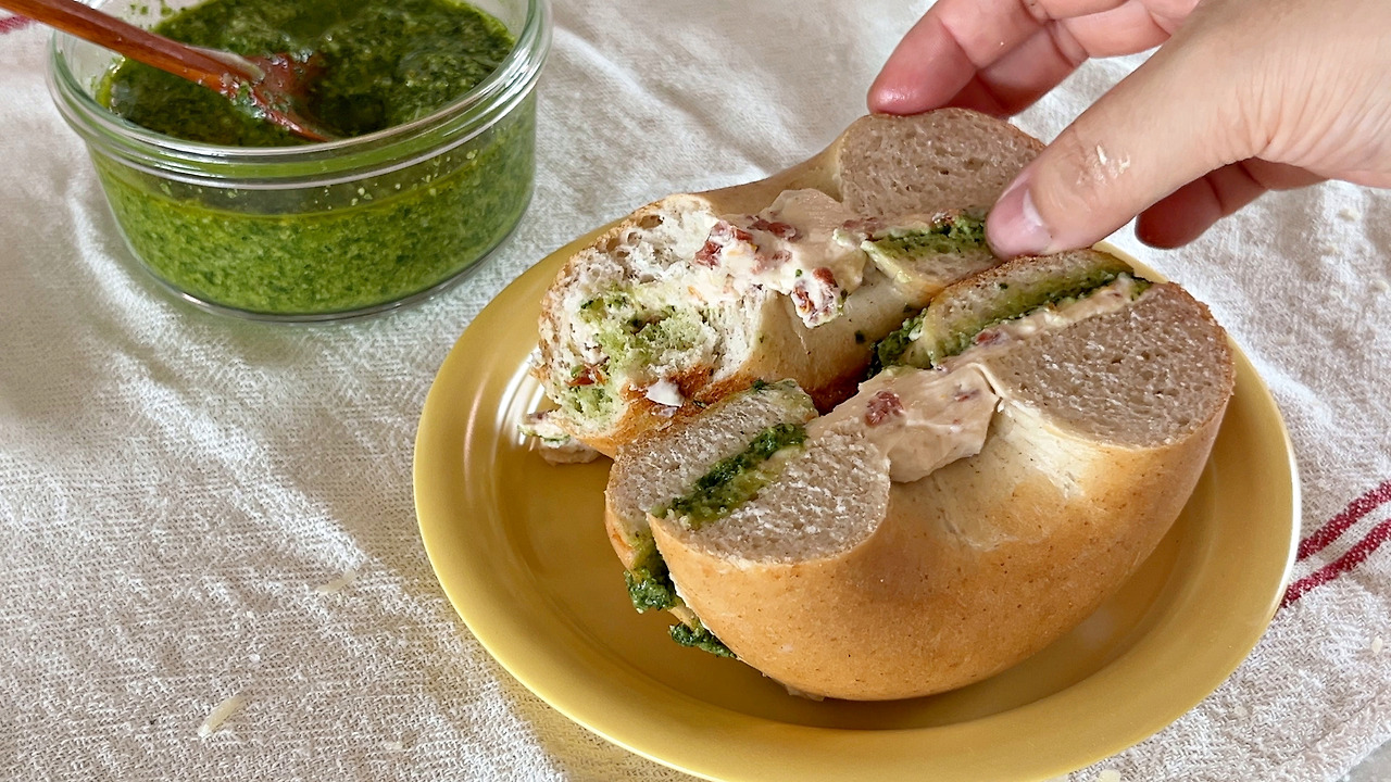 4. 베이글을 반으로 잘라 한 쪽에는 바질 페스토, 나머지 한쪽에는 토마토 크림치즈를 발라 겹쳐준다.