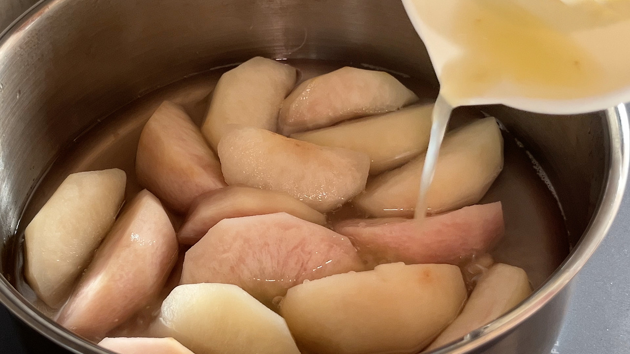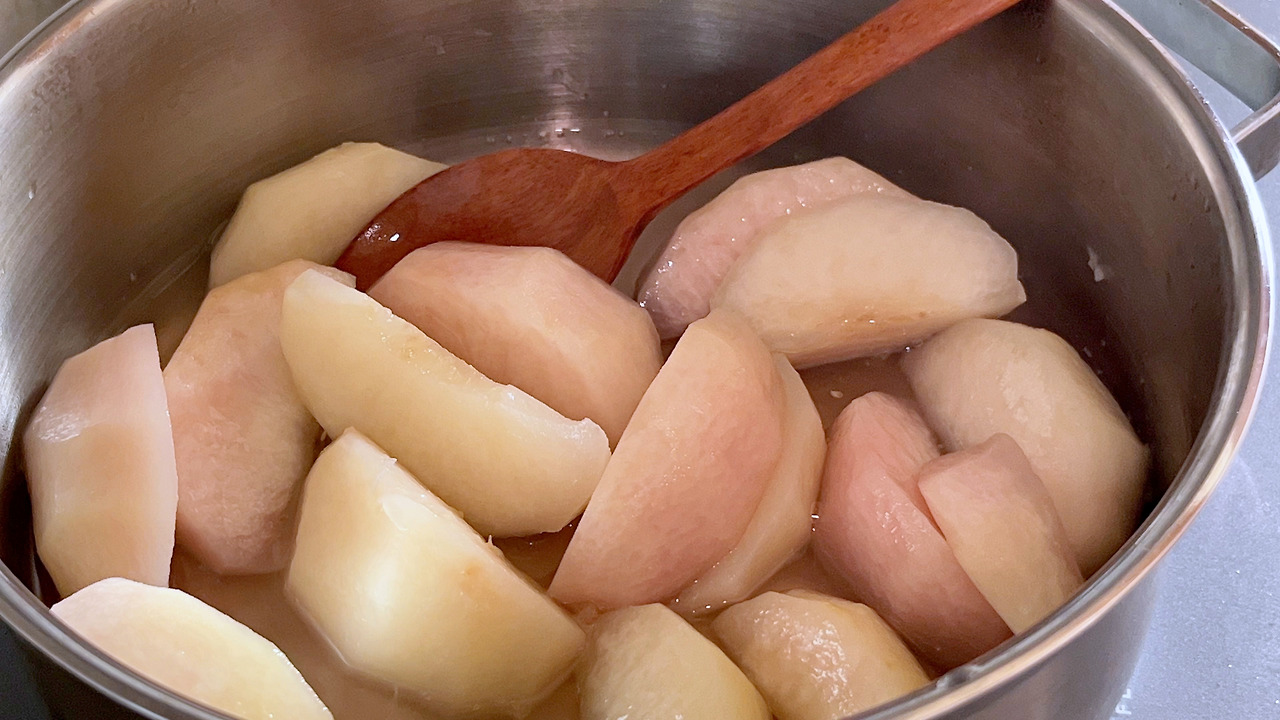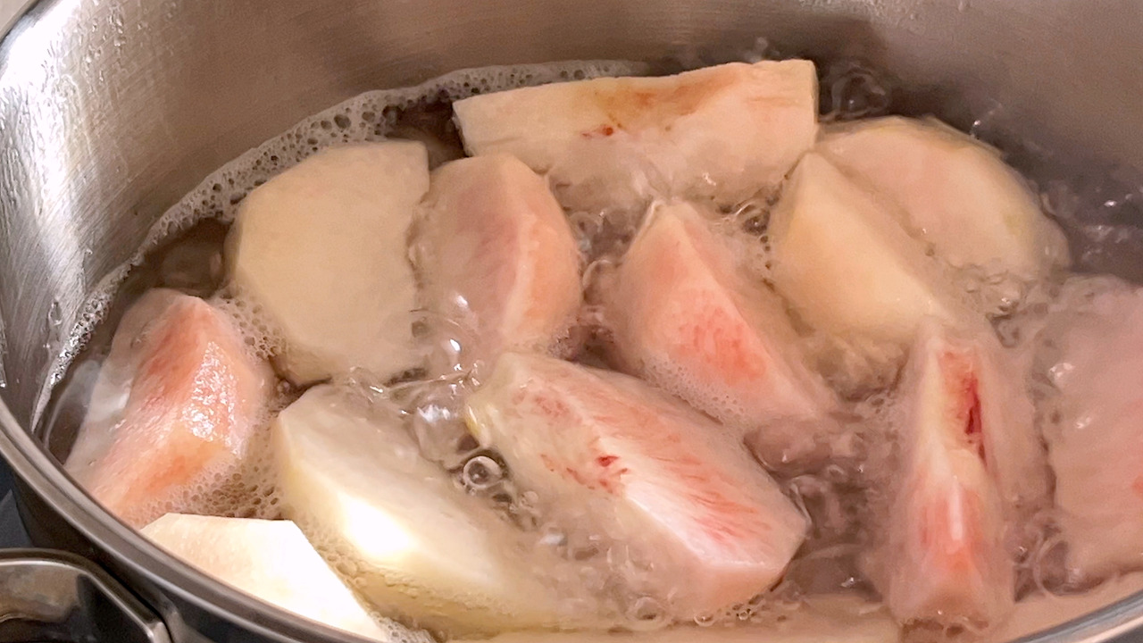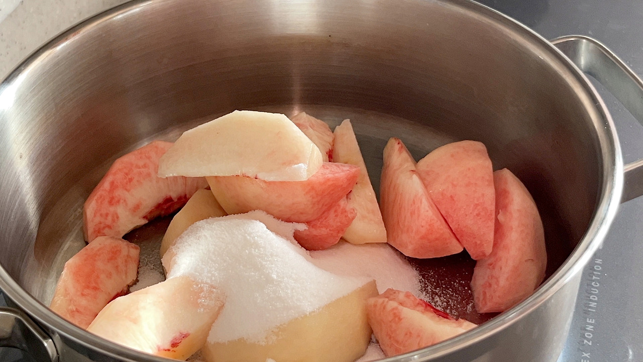 3. 냄비에 복숭아, 물, 설탕을 넣어 10분간 끓여준다.