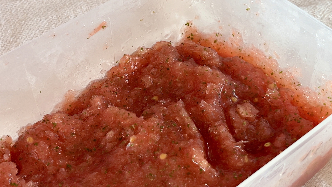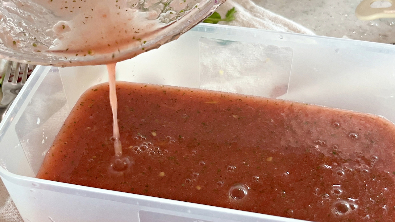 5. 4번에서 만든 토마토 주스를 통에 부은 후 냉동실에 넣어 얼리고, 3시간마다 꺼내 포크로 긁어준다.