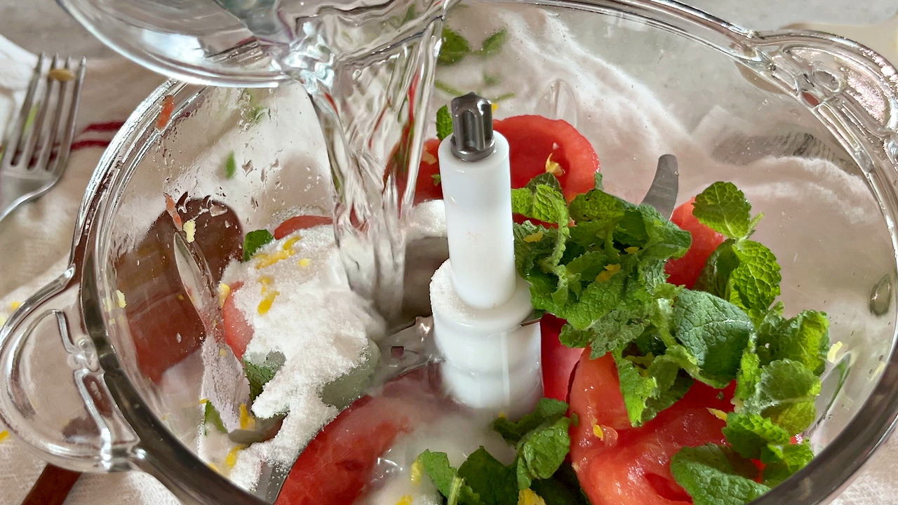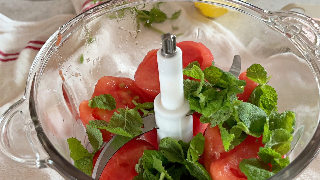 4. 블랜더에 토마토, 애플민트, 설탕, 레몬즙, 레몬 제스트, 물을 넣고 갈아준다.