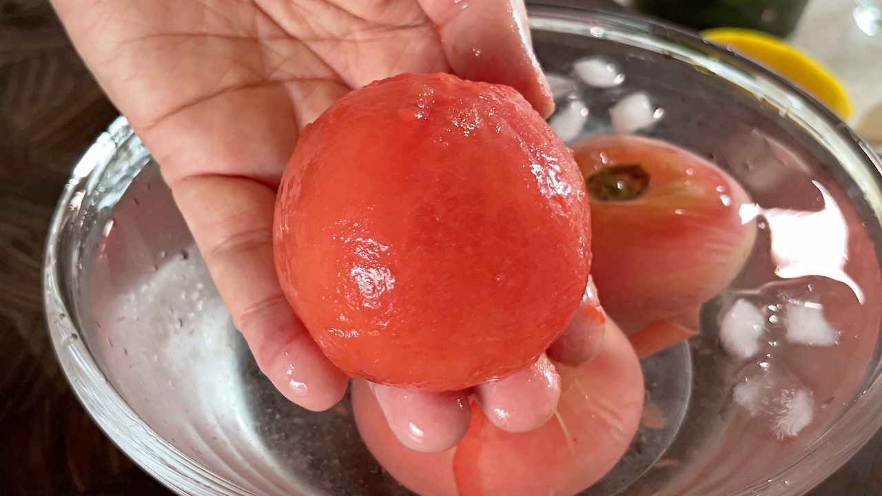 토마토 껍질은 질긴 듯하지만 의외로 쉽게 벗겨진다. 뜨거운 물에 10초만 담갔다 꺼내도 충분히 껍질을 벗길 수 있다. 만약 육안으로 껍질이 일어나는 게 보이지 않더라도 껍질을 벗기는 데에는 문제가 없으니 뜨거운 물에 넣어두는 과정은 짧게 끝내자.