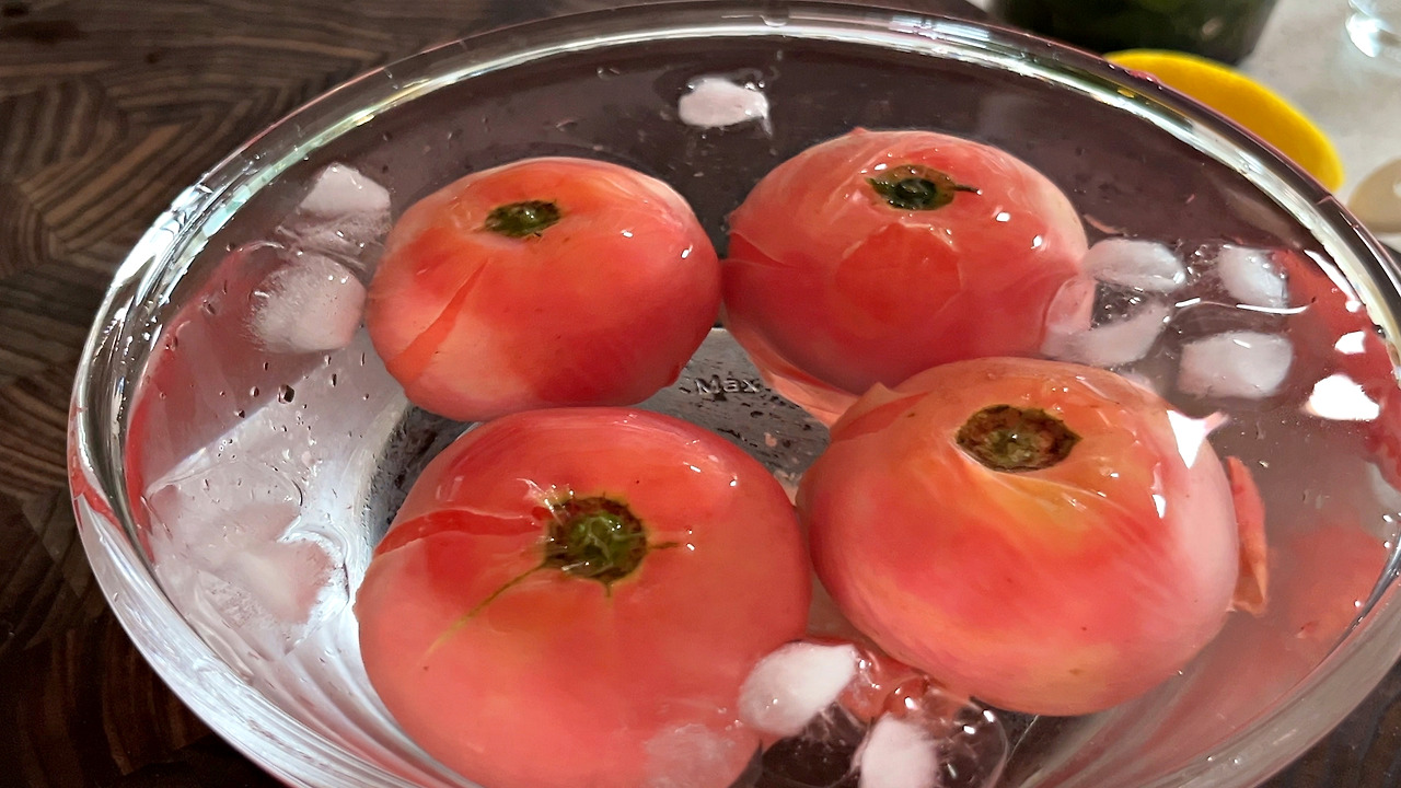 2. 토마토는 십자로 칼집을 낸 후에 뜨거운 물에 10초 동안 담갔다 꺼내 얼음물에 넣어준다.