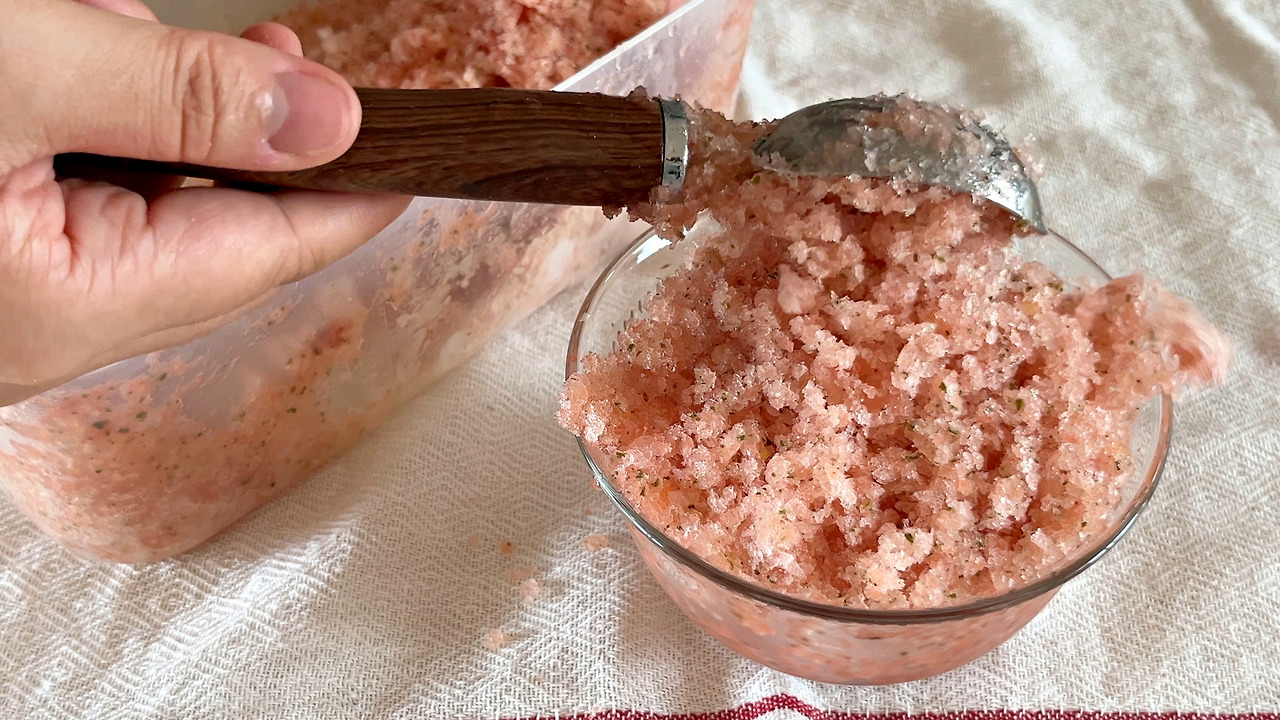 냉동실의 온도에 따라 다르겠지만 최소 2시간에서 최대 3시간마다 꺼내서 포크로 저어줘야 한다. 자주 저어 줄수록 입자가 고와져 식감이 좋게 느껴진다. 만약 시간을 깜빡해 너무 오래 얼려두었다면 실온에 잠시 두었다가 포크로 저어준 뒤에 다시 얼려주면 된다.