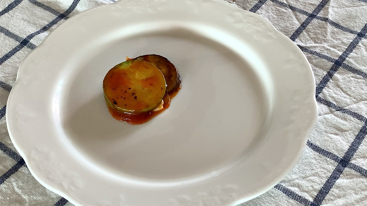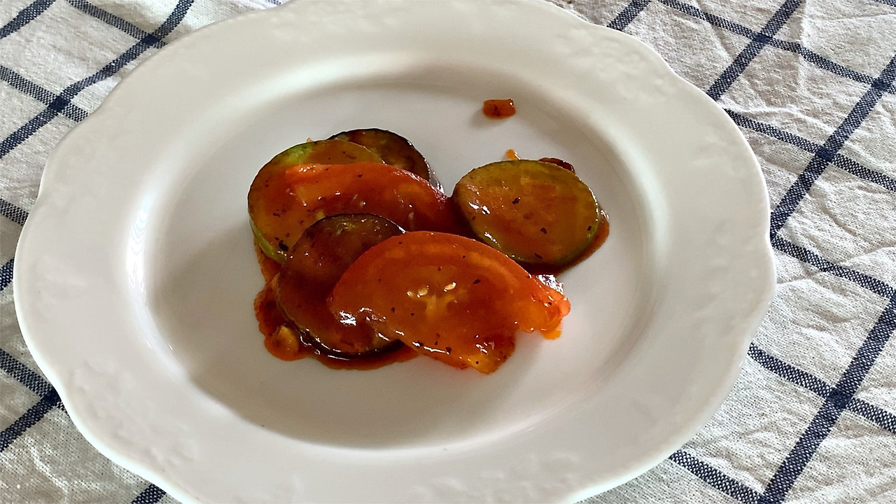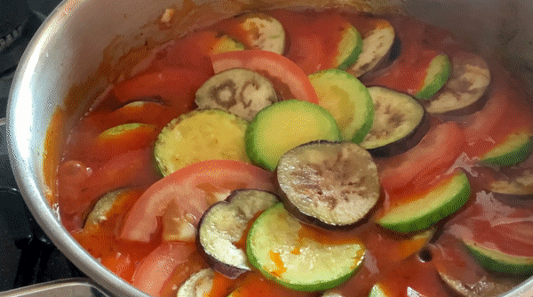 5. 소스가 완성되면 소스 위에 애호박, 가지, 토마토를 겹쳐 올린다.