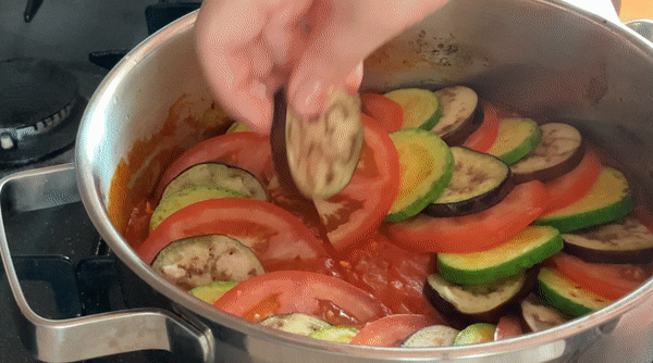사실 모양은 크게 중요치 않다. 나중에는 모든 채소와 토마토소스가 섞여 하나가 되어버릴 테니까. 하지만 영화에서 본 라따뚜이에 대한 로망이 있는 나는 하나하나 번갈아 겹쳐 올려주었다. 손이 많이 가지만 그만큼 모양도 예쁘고 그때 그 추억을 회상하며 만들 수 있다.