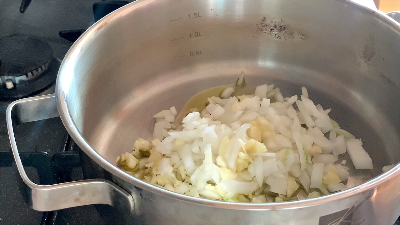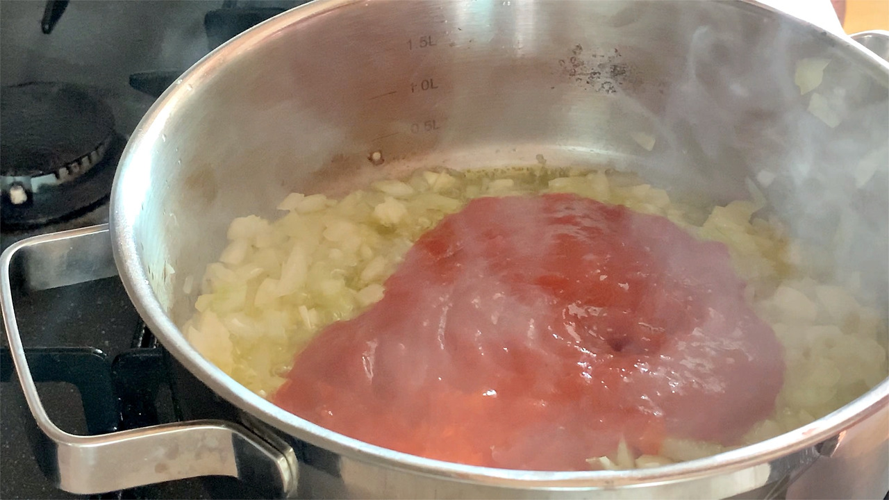 3. 넓은 냄비에 올리브 오일을 두르고 양파, 마늘을 볶아주다가 양파가 익으면 토마토소스를 넣고 끓인다.