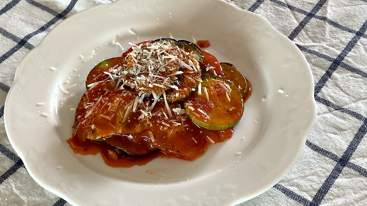 애호박 2/3개, 가지 2/3개, 토마토 1개, 양파 1/4개, 마늘 3쪽, 올리브 오일 3큰술, 토마토소스 2컵, 말린 바질 1작은술, 파마산 치즈 1큰술