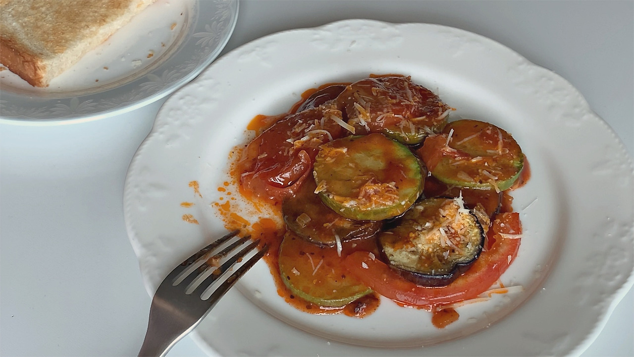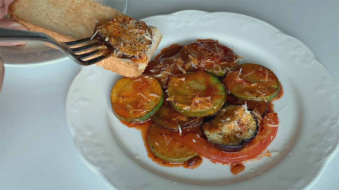 내 기억으론 영화 '라따뚜이'에서는 파마산 치즈를 뿌리지 않았다. 하지만 내 라따뚜이에는 일부러 소금 간을 하지 않았기 때문에 마지막에 짭짤한 파마산 치즈를 올려주었다. 치즈 특유의 쿰쿰한 향이 라따뚜이의 토마토소스와 잘 어울리고 자칫 밋밋해질 수 있는 플레이팅에 조금이나마 도움을 준다. 만약 파마산 치즈가 아닌 모차렐라 치즈를 사용한다면 더 고소한 라따뚜이가 될 것이다. 만약 오븐이 있었다면 모차렐라 치즈를 얹고 그 위에 파마산 치즈를 한번 더 올렸을 것이다.