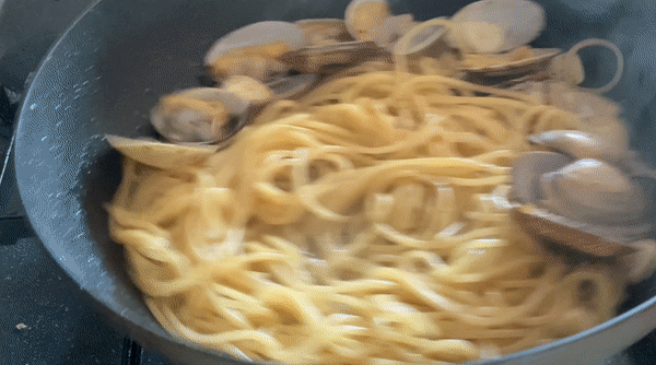 4. 바지락이 다 익으면 스파게티, 후추, 면수 2큰술을 넣고 볶아준다.