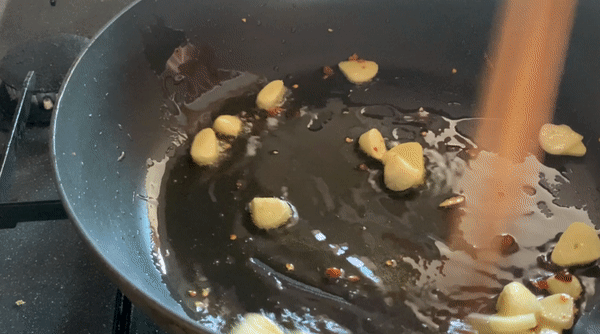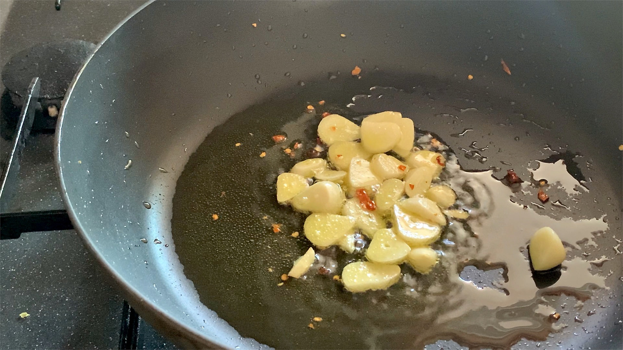 2. 약불에 달군 팬에 올리브 오일, 마늘, 페퍼론치노를 넣고 볶아준다