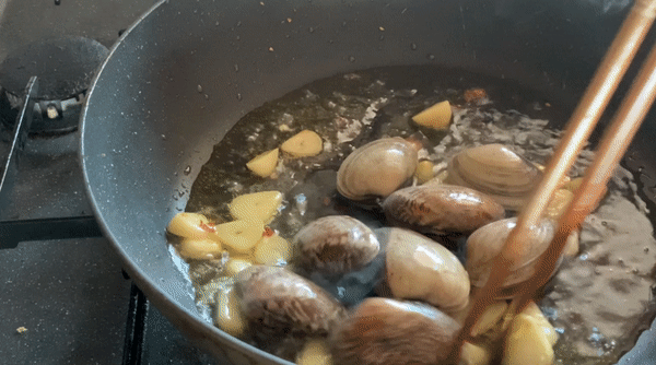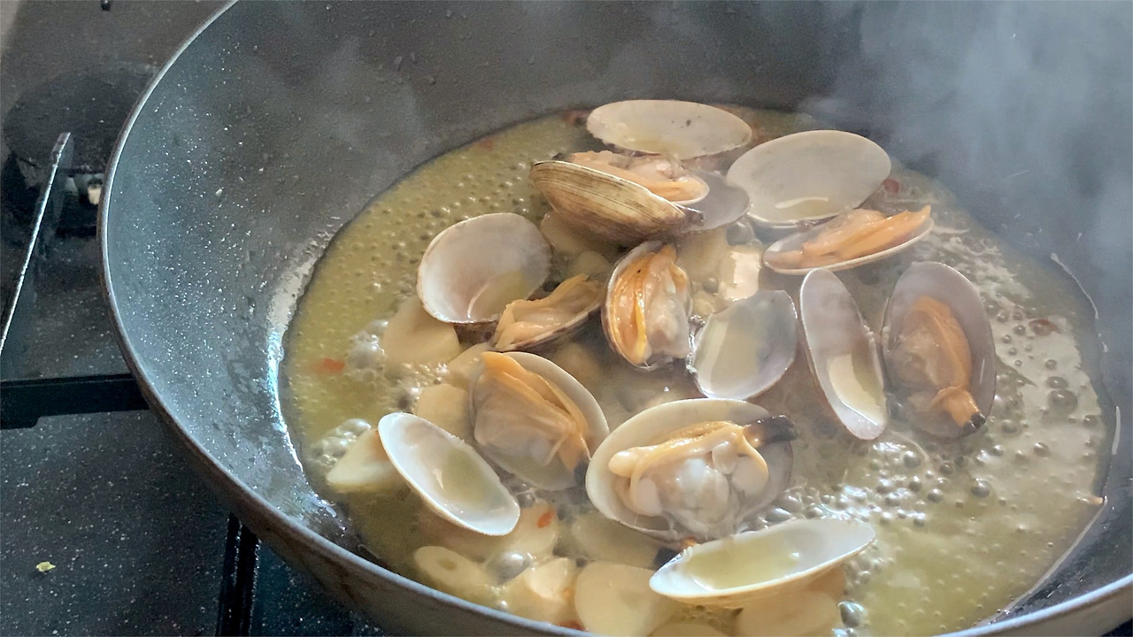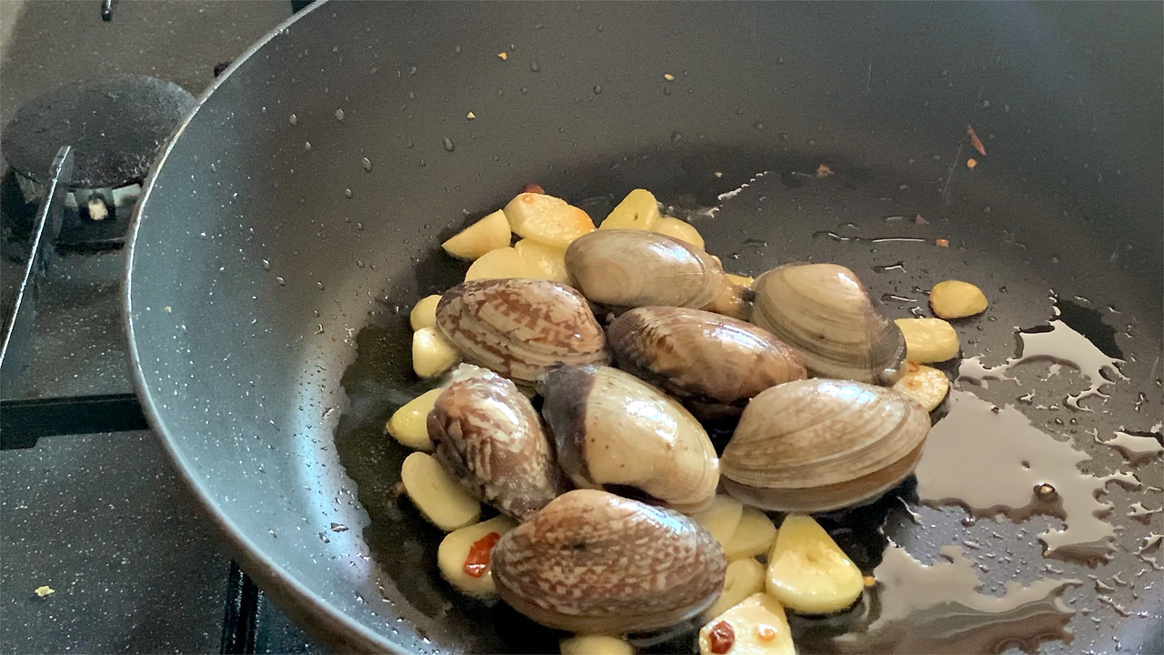 3. 마늘이 노릇해지면 바지락, 화이트 와인을 넣고 볶아준다.