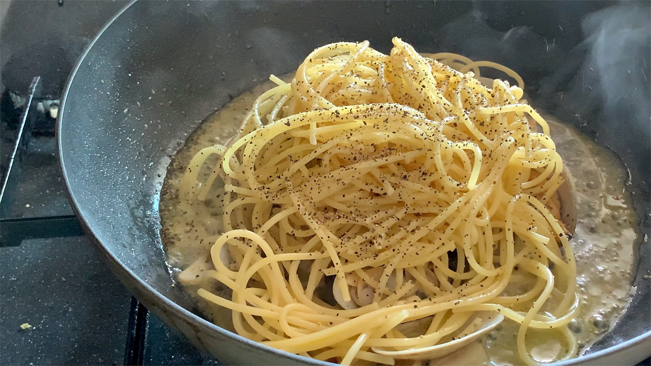 바지락은 스스로 짭짤한 감칠맛을 소스에 뱉어낸다. 만약 여기에 소금 간을 한다면 과하게 짭짤한 봉골레 파스타가 될 것이다. 간을 하지 않은 채로 맛을 보고 부족하다면 면수로 간을 조절하자. 또한 바지락의 비릿함을 모두 없애버리고 싶다면 이 단계에서 후추를 넉넉히 넣어주자.