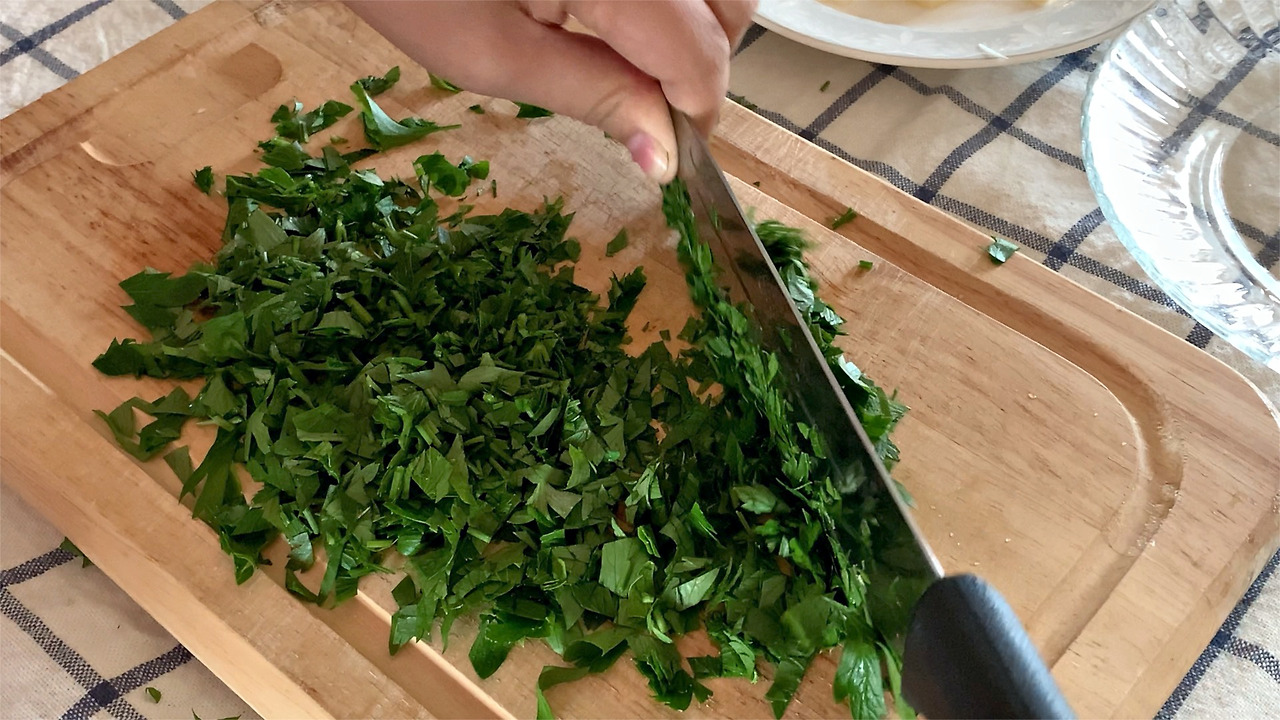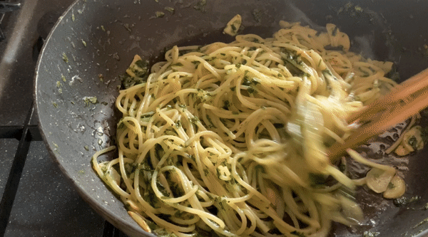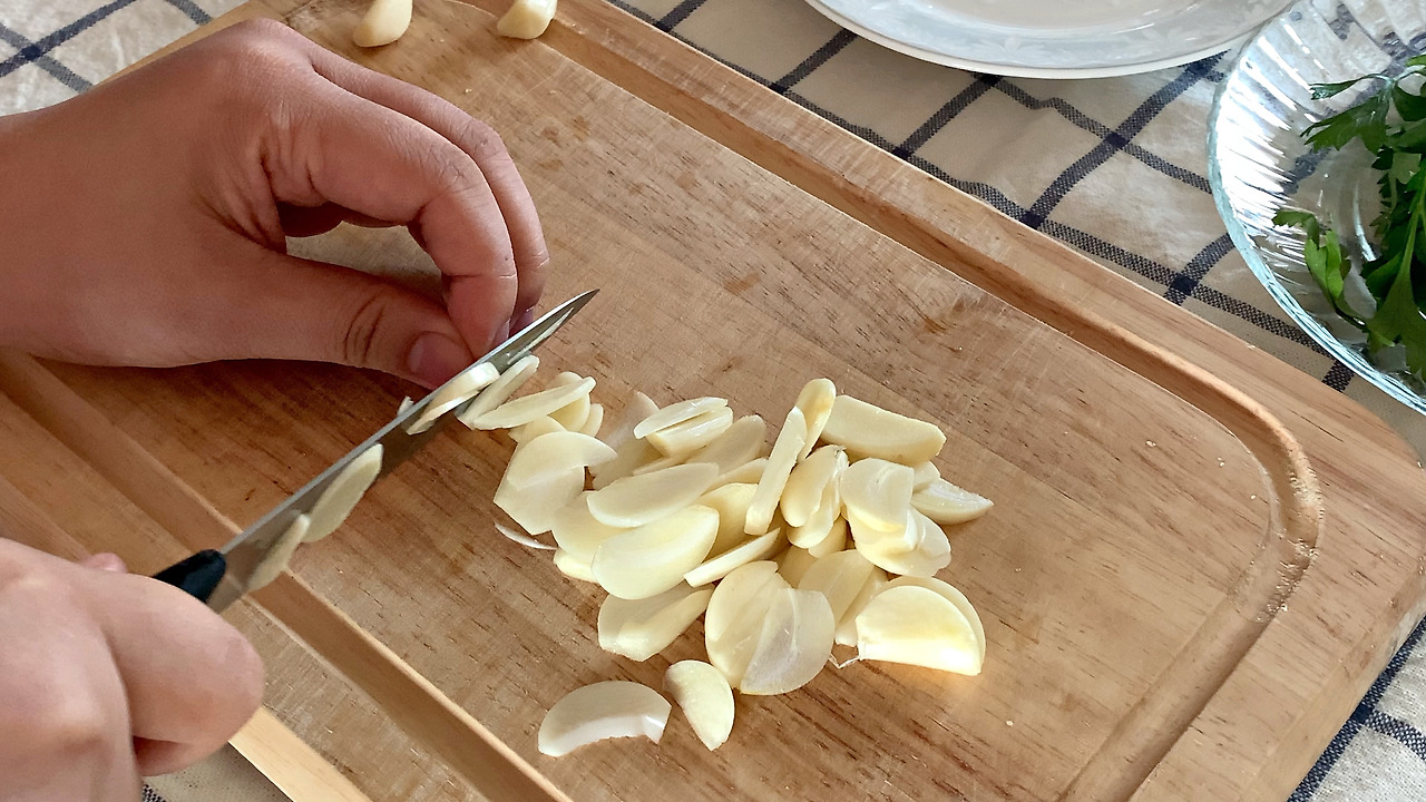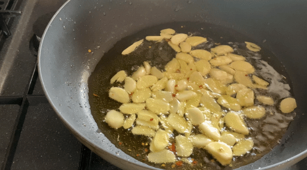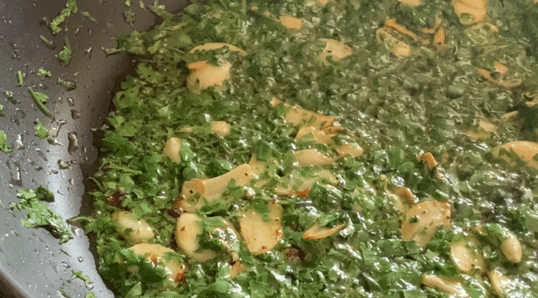 마늘을 얇게 썰었기때문에 금방 익는것이 당연하다. 하지만 그만큼 빨리 탄다는 위험요소가 있다. 중약불 정도의 불에서 조리를하며 마늘이 반 정도 노릇해질때까지 익혀주자. 만약 파슬리를 가지러간 사이에 마늘이 다 타버릴 것 같다면 아예 불을 끄고나서 파슬리를 가져와 팬에 넣어주자.