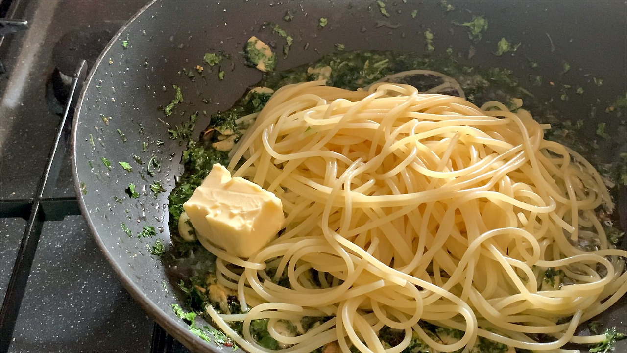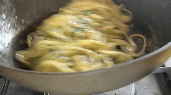3. 소금을 넉넉히 넣은 물에서 익힌 스파게티, 면수 3큰술, 버터를 넣고 볶아준다.