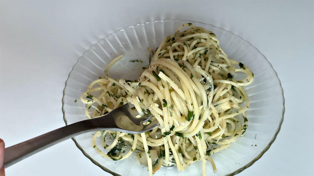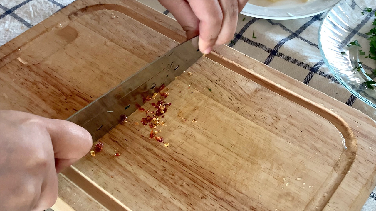 평소 파스타를 만들때 두께가 살짝 있는 편마늘을 사용하는것을 좋아한다. 그렇게 하면 마늘이 쉽게 타지 않을뿐더러 포슬포슬한 느낌이 좋기때문에. 하지만 이 요리를 탄생시킨 셰프가 '더 셰프쇼'에 직접 나와 알려준 레시피에서는 마늘을 최대한 얇게 썰어 사용하라고 한다. 첫 입을 먹고 그 이유를 단번에 알았다. 이 파스타에서는 마늘이 두꺼워선 안된다. 얇게 썰어 면 사이사이 잘 들어가도록 해야한다.