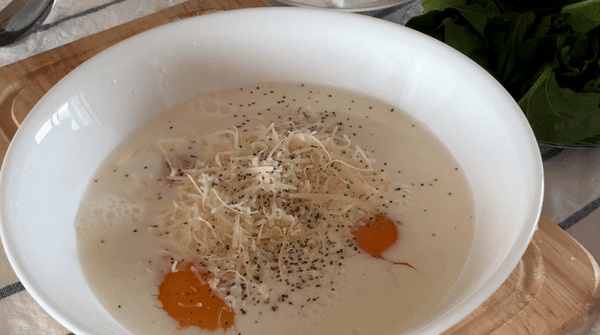 2. 계란, 우유, 파마산 치즈를 넣고 부드러워질 때까지 저어준다.