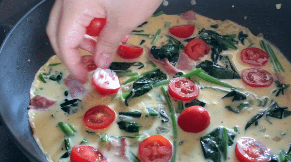4. 시금치의 숨이 살짝 죽으면 계란물, 방울토마토를 넣어 약불에서 천천히 익혀준다.