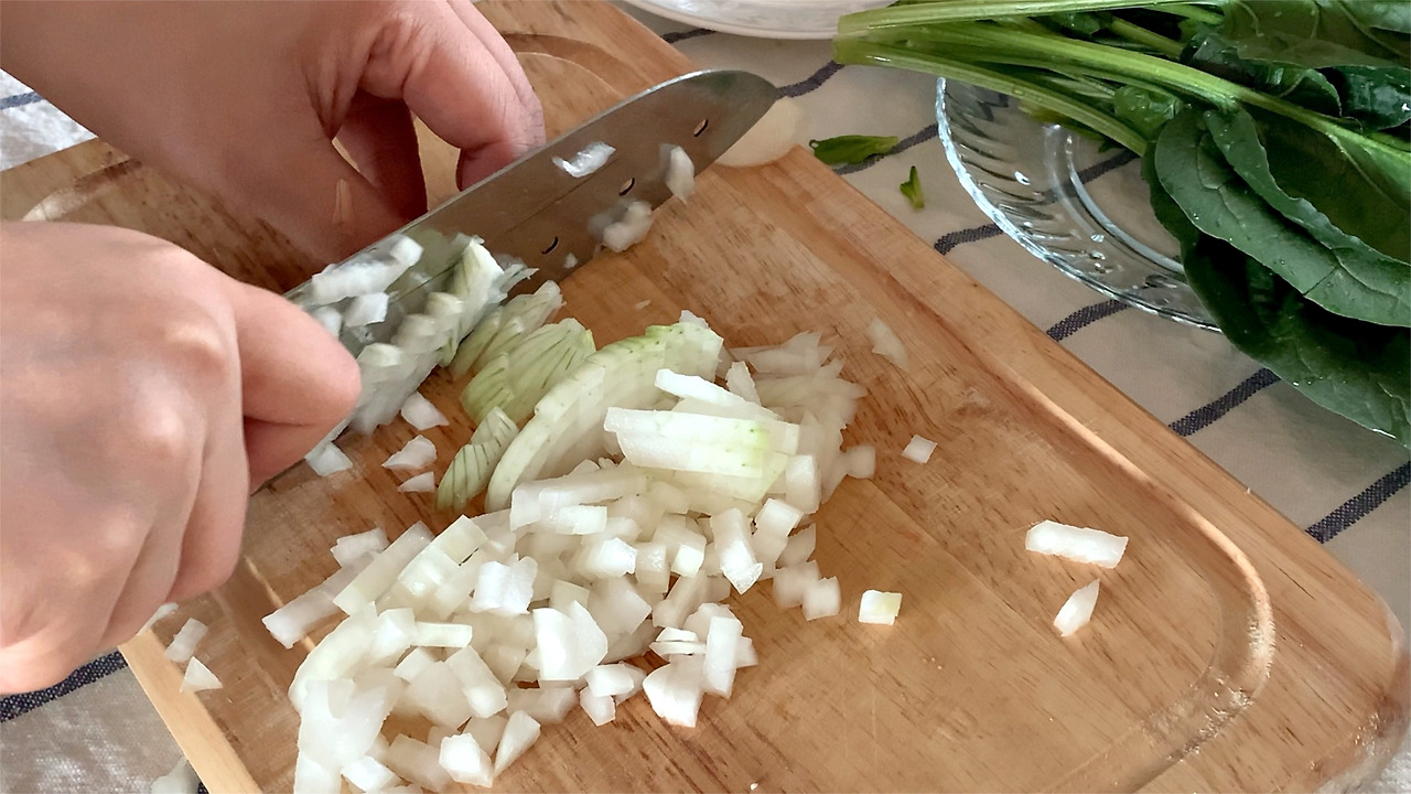 3. 달군 팬에 올리브 오일을 두르고 양파, 베이컨, 시금치를 넣어 볶아준다.