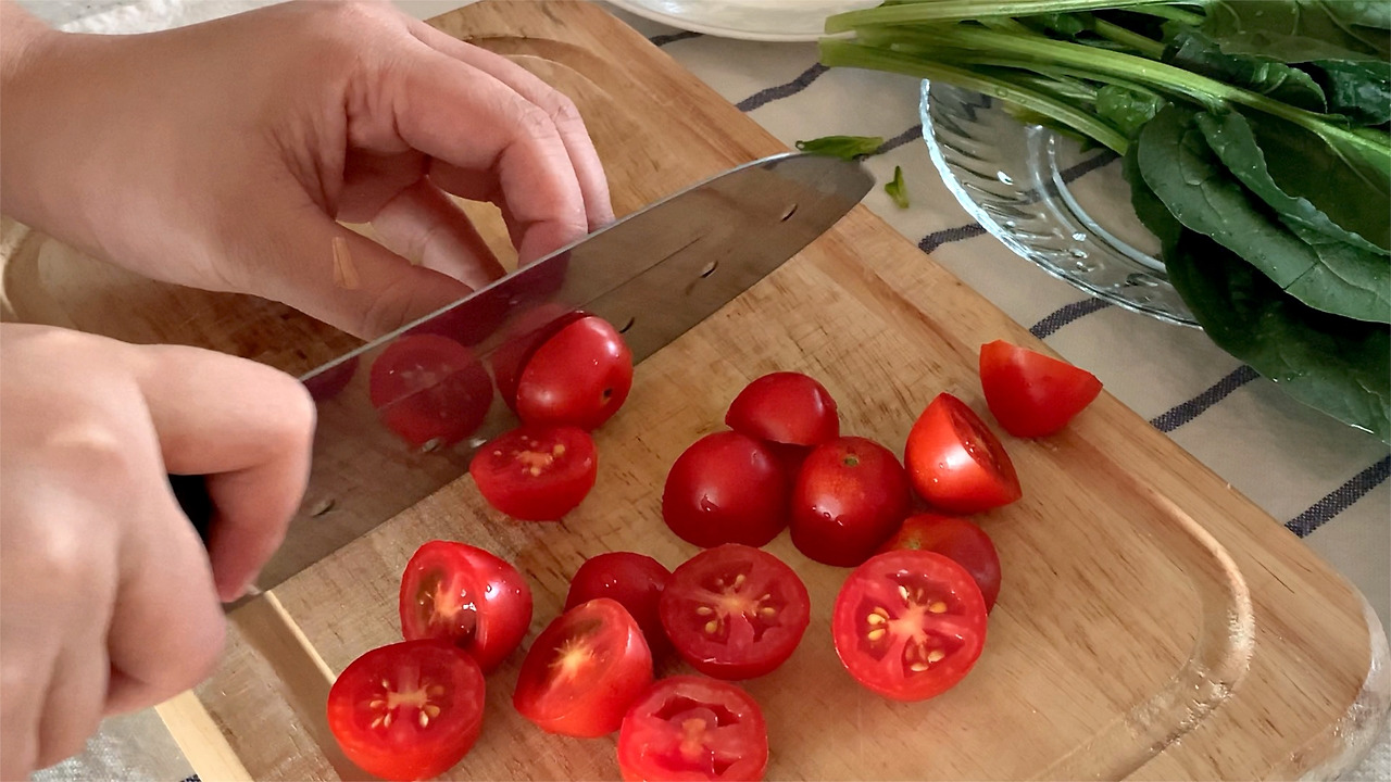 1. 시금치와 양파는 굵게 다져주고 방울토마토는 반을 갈라 준비한다. 베이컨은 적당한 크기로 썰어준다.