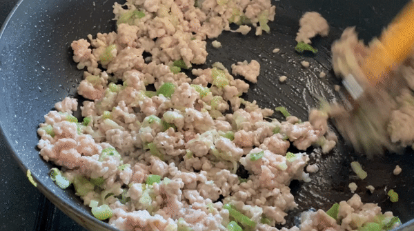 3. 달군 팬에 식용유와 파를 넣어 파 기름을 낸 후에 밑간 한 돼지고기를 넣어 볶는다.