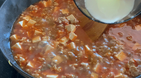 5. 두부를 넣은 후에 전분물을 조금씩 넣어 농도를 조절한다.