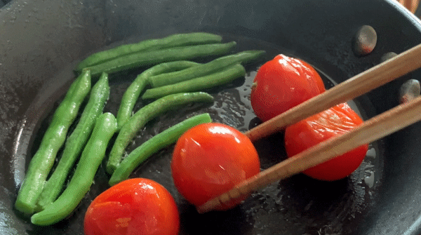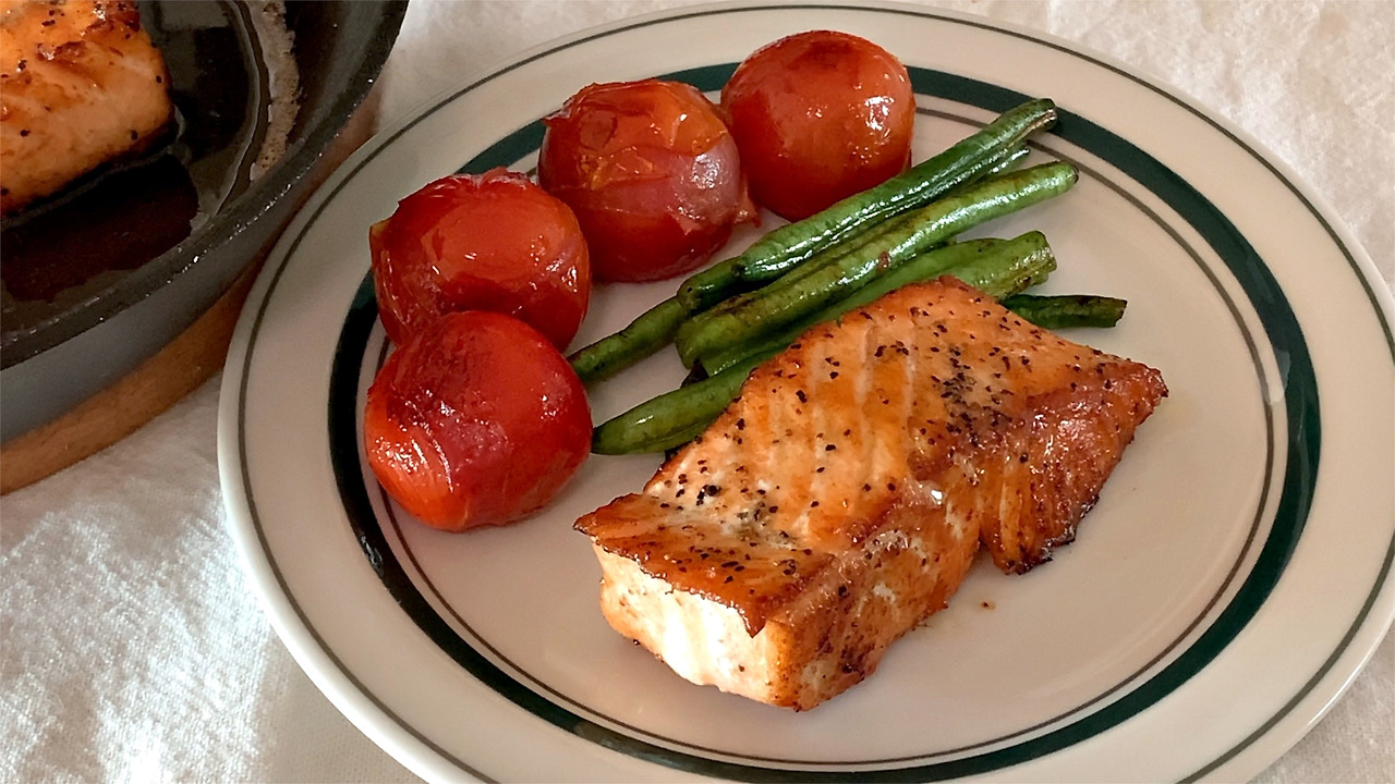 연어 200g, 올리브 오일 3큰술, 버터 1큰술, 소금 약간, 후추 약간, 그린빈7-8개, 방울토마토 5개
