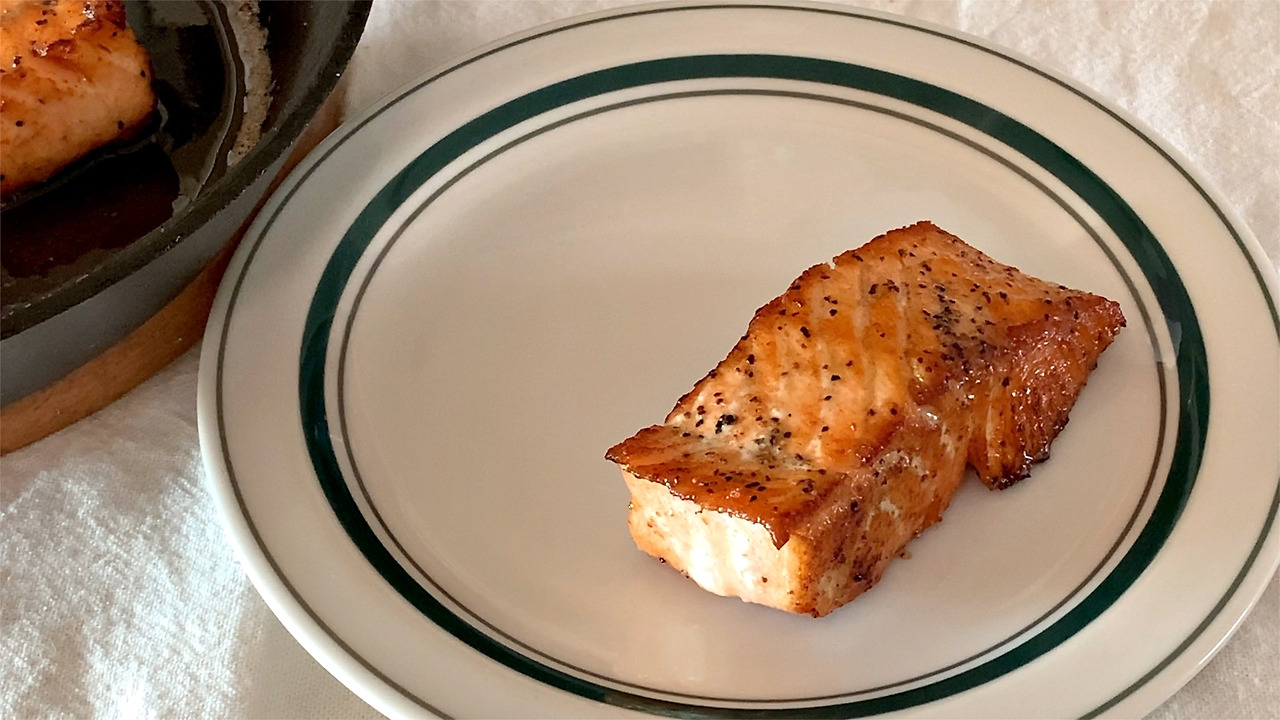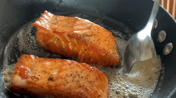 연어는 생각보다 익는 시간이 빠르다. 그렇기 때문에 처음에는 중불, 겉이 바삭해지면 약불로 줄여 천천히 짧게 익혀주자. 그리고 연어가 거의 다 익었을 때쯤 버터 샤워를 시켜주자. 버터의 향으로 연어의 비릿함을 살짝 잡아줄 수 있고 풍미를 더해준다.