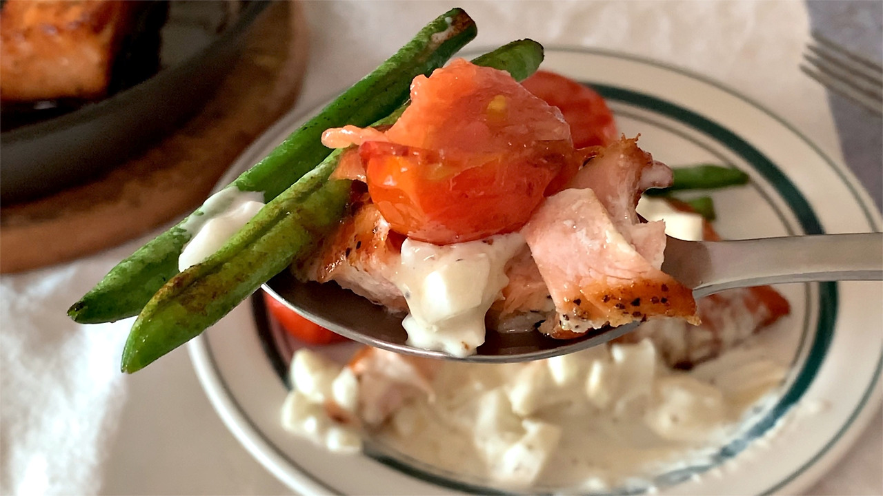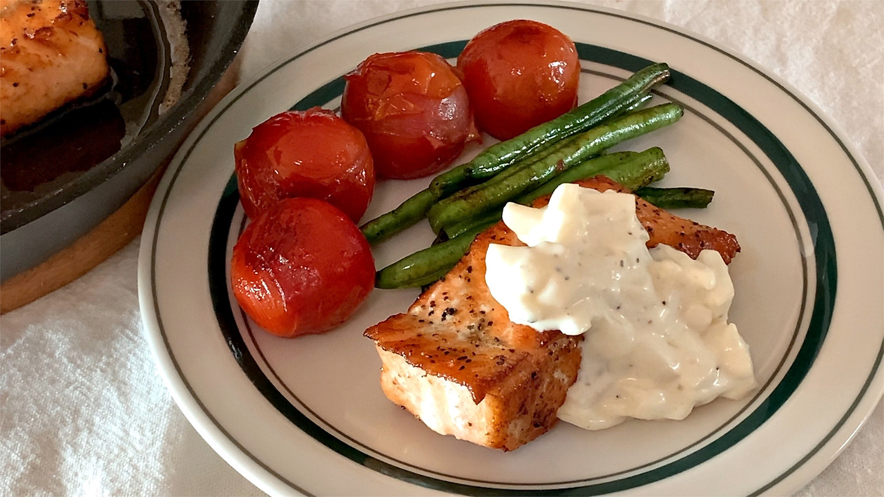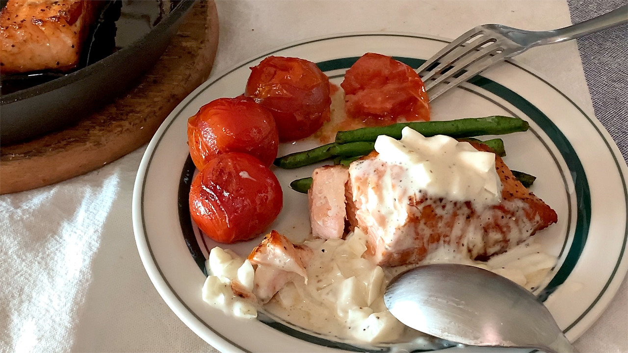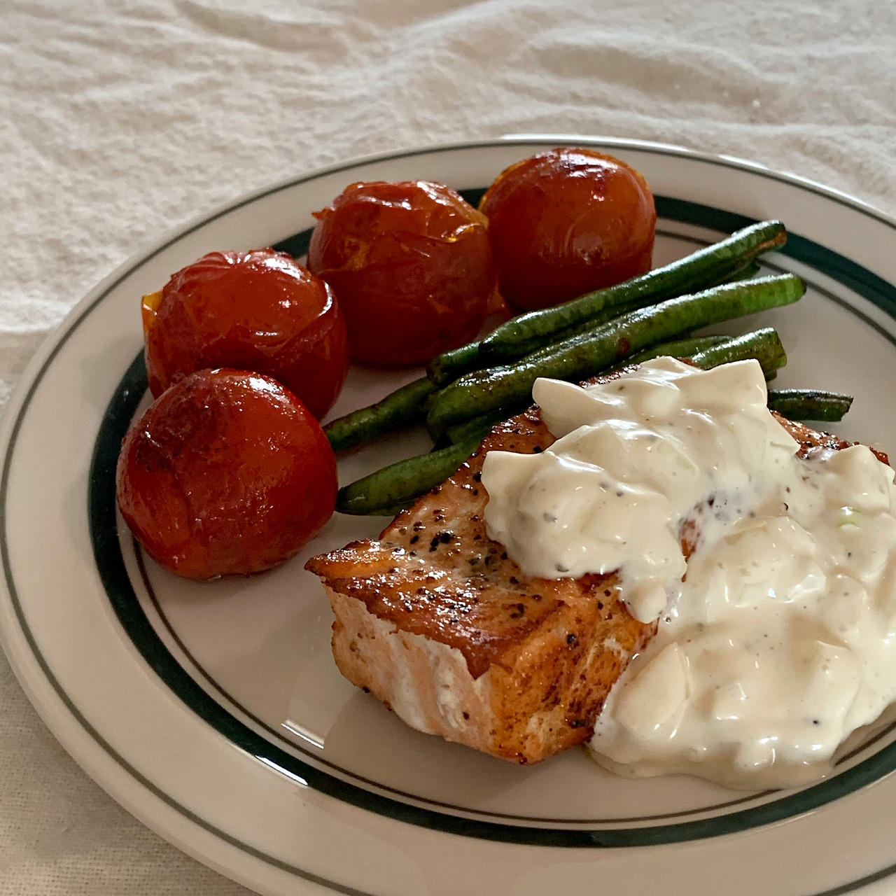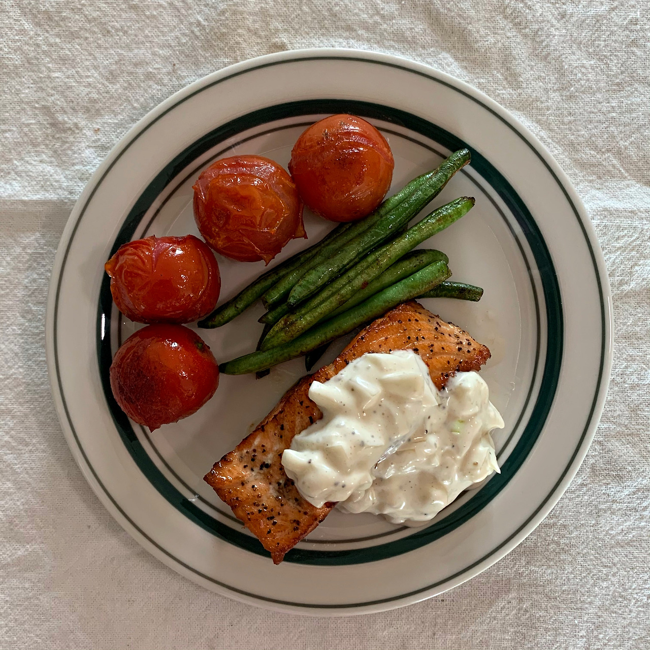 접시에 구운 연어를 올리고 방울토마토, 그린빈을 옆에 놓은 후 홀스래디쉬 소스를 뿌려준다. 사실 난 개인적으로 토마토와 생선구이를 같이 먹는 것을 좋아하지 않는다. 따로 먹으면 괜찮지만 같이 먹으면 생선의 비릿함이 2-3배는 강조되어 느껴진다. 하지만 익힌 방울토마토는 달랐다. 연어, 방울토마토, 홀스래디쉬 소스를 스푼에 올려 한꺼번에 입에 넣어보자. 방울토마토의 채즙과 홀스래디쉬 소스가 만나 더할 나위 없이 훌륭한 소스가 된다. 더욱 진한 맛의 소스가 재탄생되는 것이다. 이제부터 방울토마토와 연어는 떼려야 뗄 수 없는 사이가 됐다.