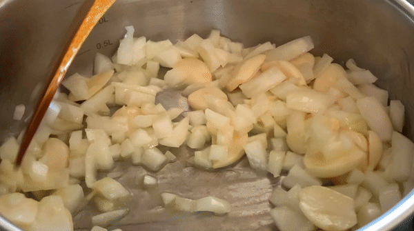3. 달군 냄비에 올리브 오일, 버터, 양파, 마늘을 넣어 볶아준다.