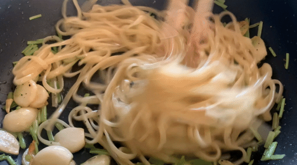 3. 마늘이 살짝 노릇해지면 익힌 스파게티, 면수 2-3큰술, 소금, 후추를 넣어 볶는다.